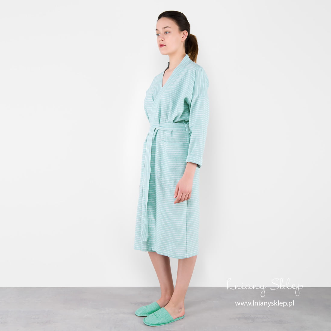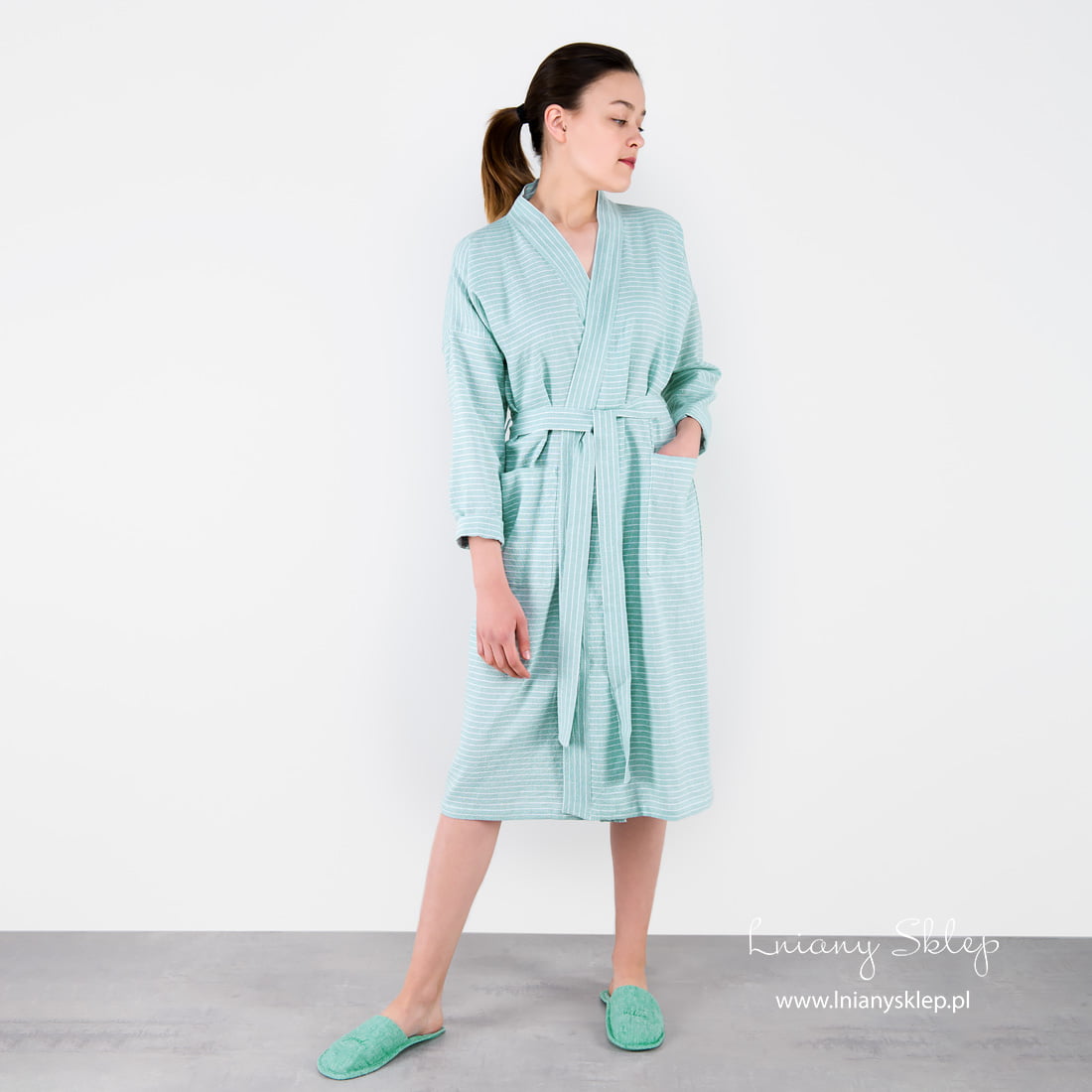 Lniany damski jasny zielony szlafrok w cieniutkie białe paski. Ściągany szerokim pasem, z przodu wyposażony w kieszenie. Brzeg szlafroku wykończony został szerokim pasem tkaniny z pionowo biegnącymi paskami, co wygodnie kontrastuje z poziomo ułożonymi paskami na samym szlafroku. Szlafrok uszyliśmy z pranej w procesie produkcji tkaniny lniano – bawełnianej: jest miękki, przytulny, nie ściągnie się po kolejnych praniach, świetnie wchłania wilgoć, szybko wysycha i nie zajmie zbyt wiele miejsca w walizce, jeżeli zabierzesz go w podróż.