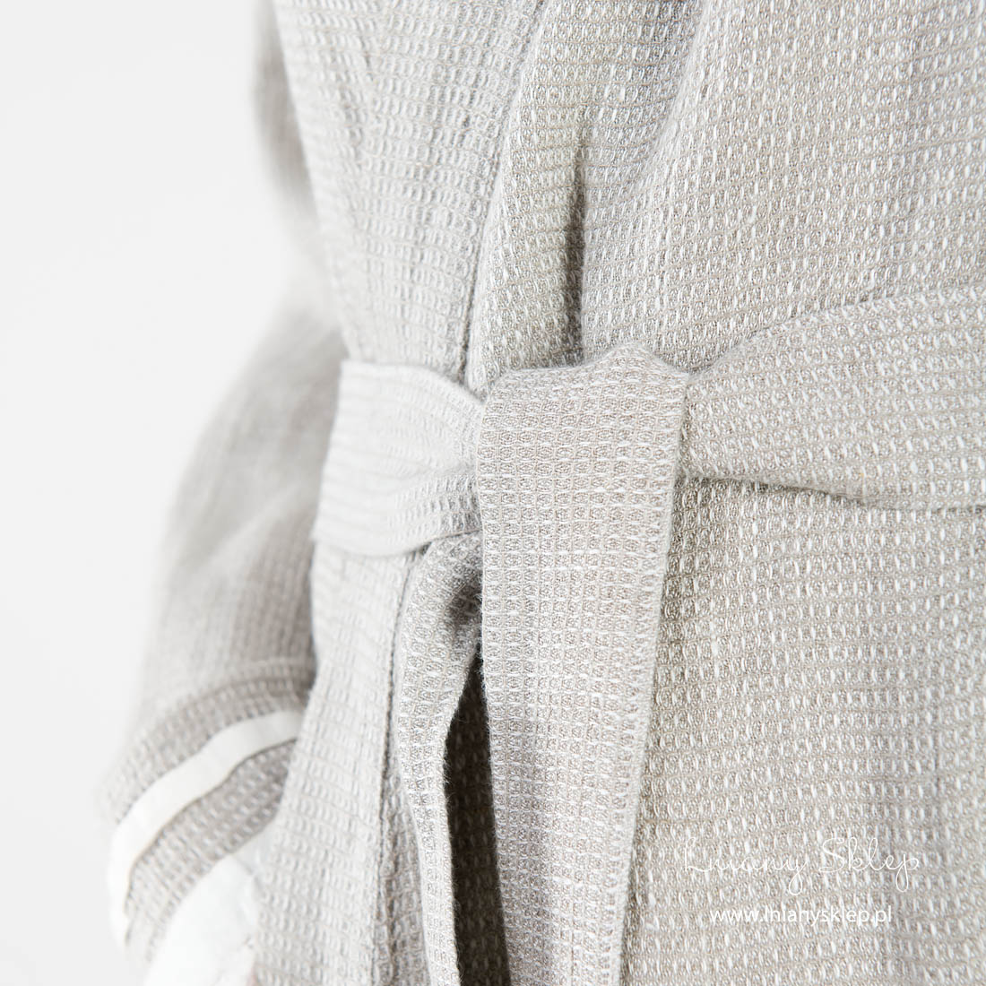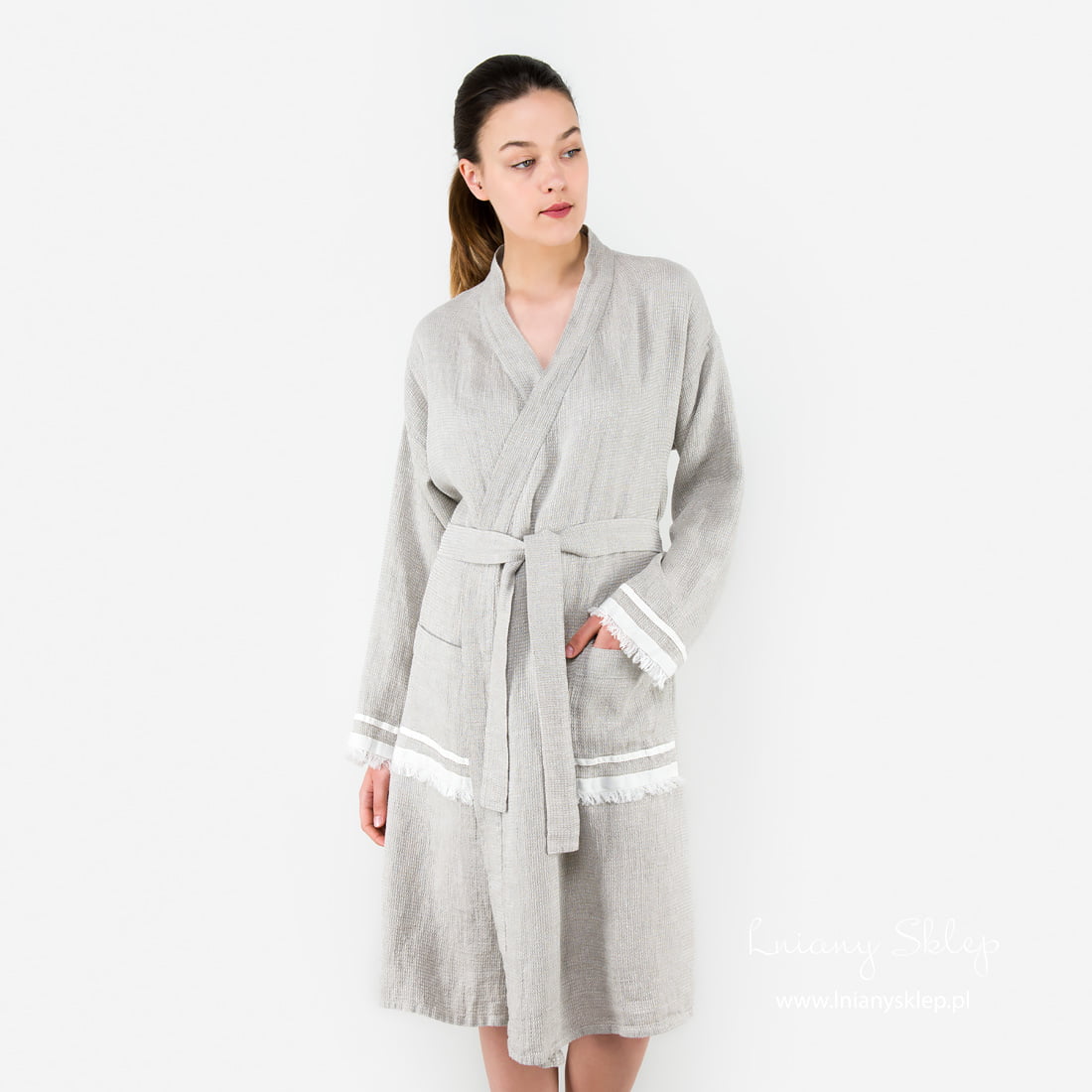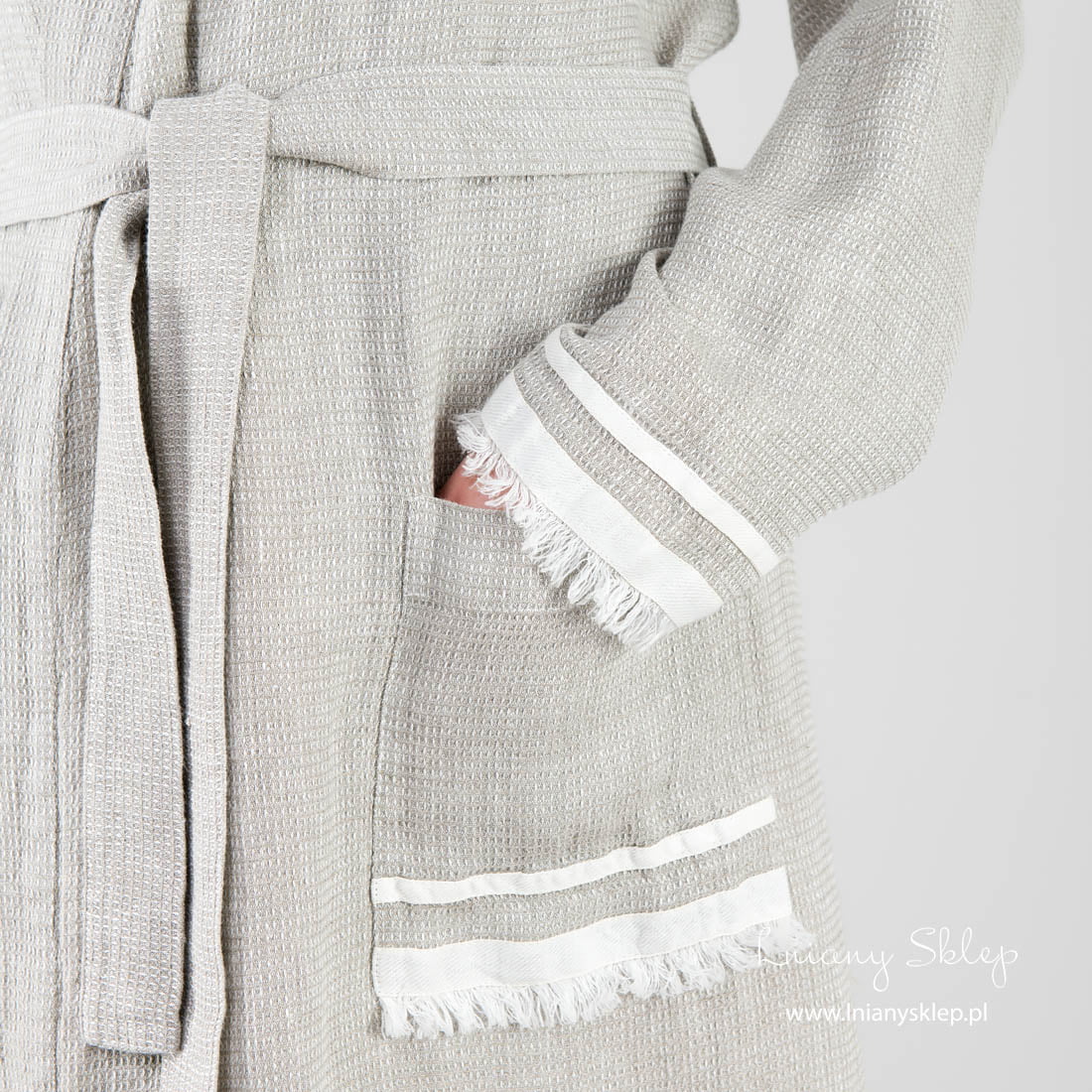 Lniany damski szlafrok szary z frędzelkami, zawiązywany paskiem. Tkaninę „waflową” wytakliśmy z przędzy 100% lniane białej i niebarwionej (szara, lekko piaskowa). Rękawa i kieszenie w dole są ozdobione białymi paskami i frędzelkami. Szlafrok z pranego lnu jest mięciutki i przytulny.