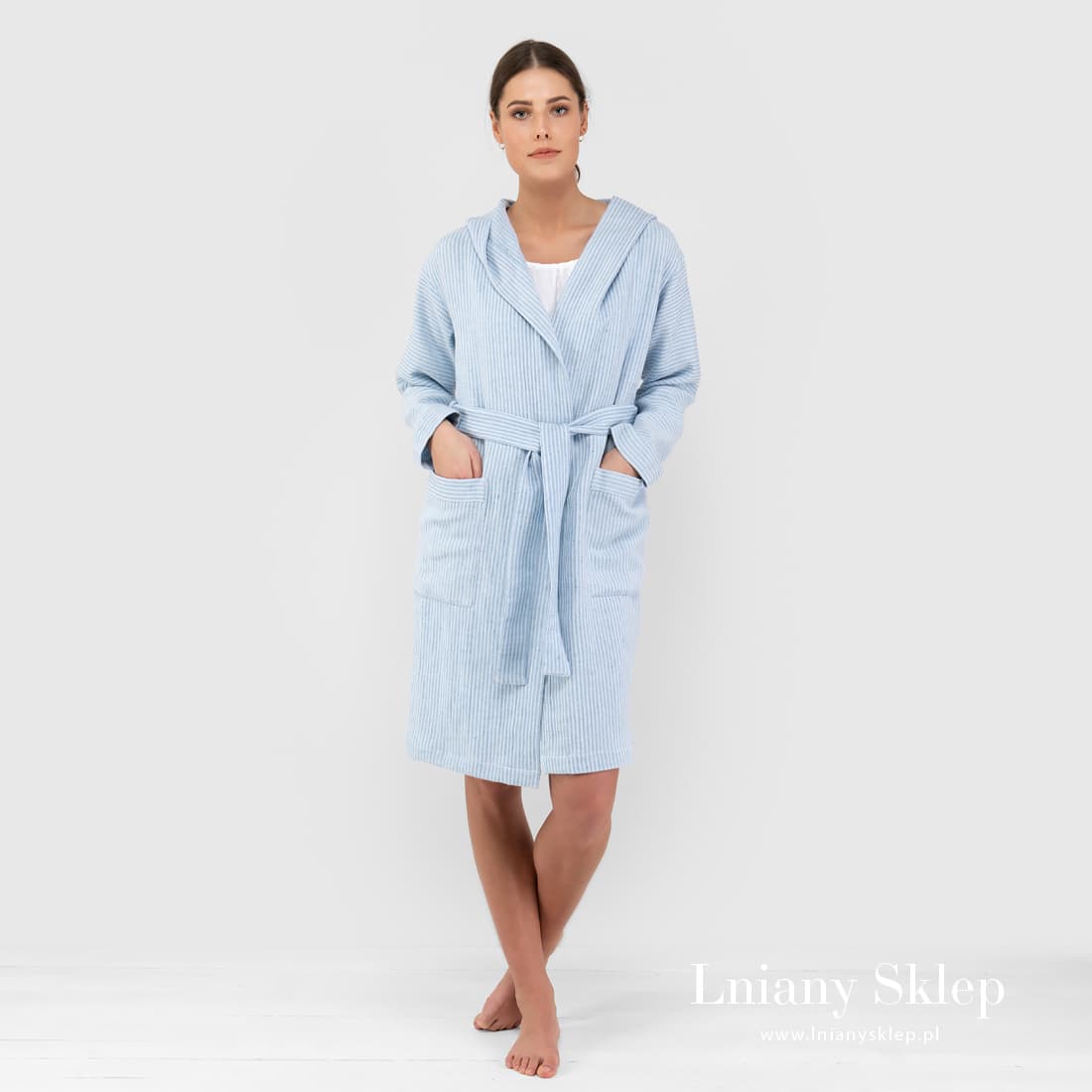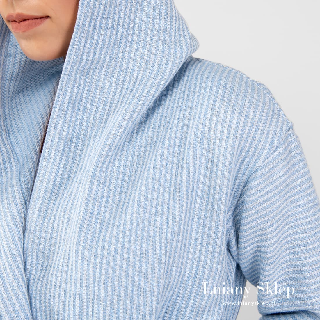Niebieski szlafrok z kapturem z tkaniny wytkanej w pionowe paski z przędzy lnianej błękitnej i mlecznobiałej (lekko żółtawe) bawełnianej. Lekki szlafroczek z pranej, mięciutkiej tkaniny ma kieszenie z przodu, jest zawiązywany w talii szerokim paskiem. Wygodny, wykonany w pastelowej kolorystyce szlafrok do łaźni i SPA albo po prostu do narzucenia na siebie do porannej kawy. Nie zajmie zbyt wiele miejsca w walizce – weź go ze sobą w podróż!