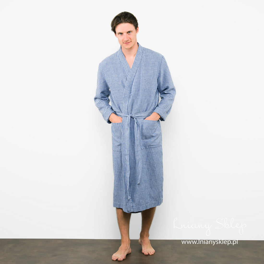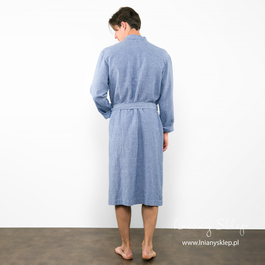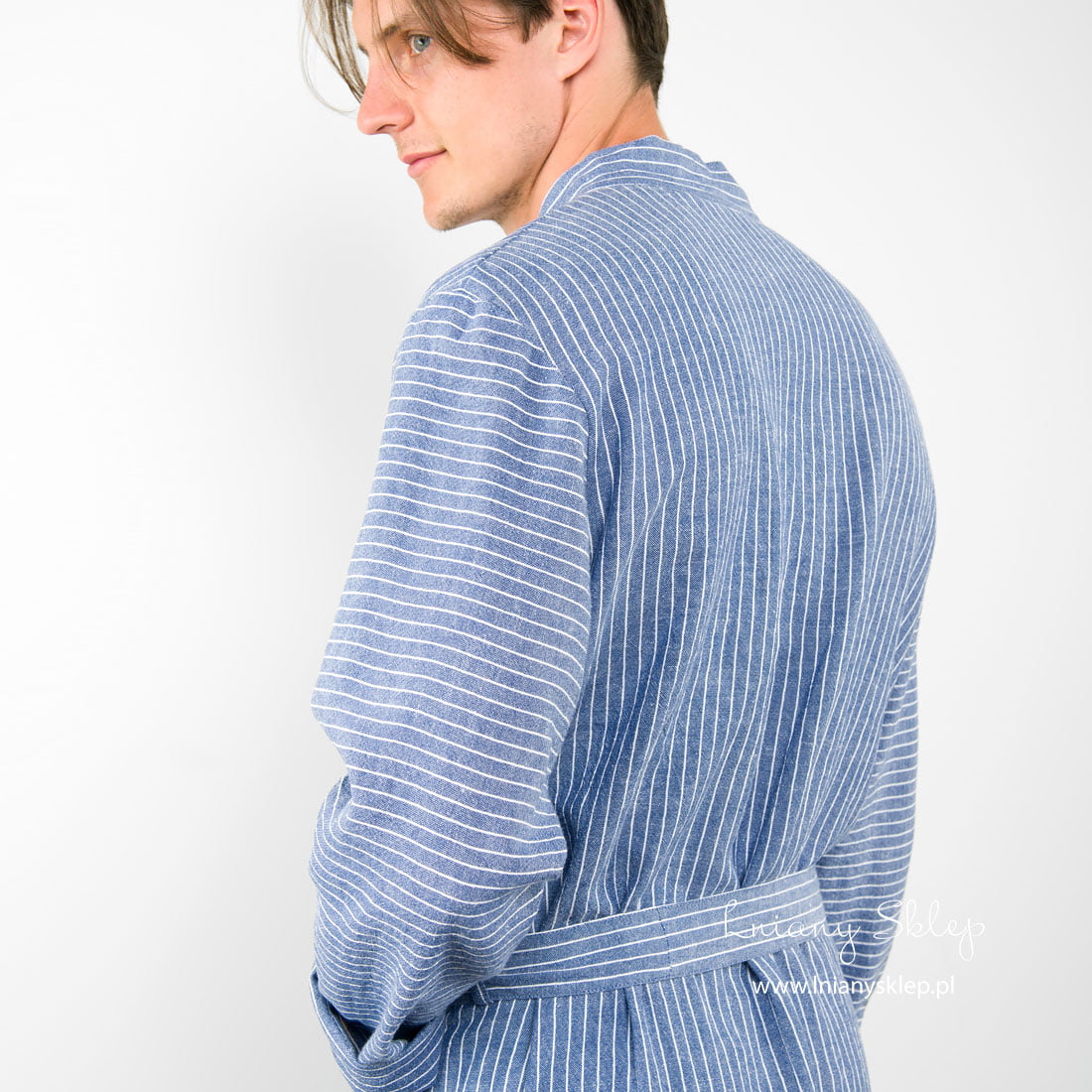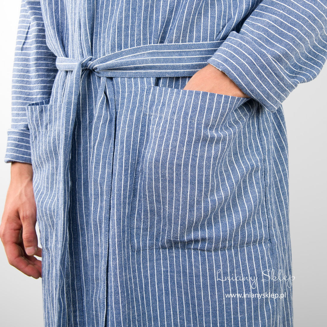 Lniany szlafrok męski niebieski w paski jest wiązany paskiem, ma duże kieszenie z przodu, nie ma zapięcia. Szlafrok uszyliśmy z pranej tkaniny lniano – bawełnianej wytkanej w cieniutkie, biegnące pionowo białe paski. Naturalna tkanina lekko wchłania wilgoć, szybko schnie. Szlafrok przyda się nie tylko na co dzień, ale i w czasie podróży – nie zajmie zbyt wiele miejsca w walizce.