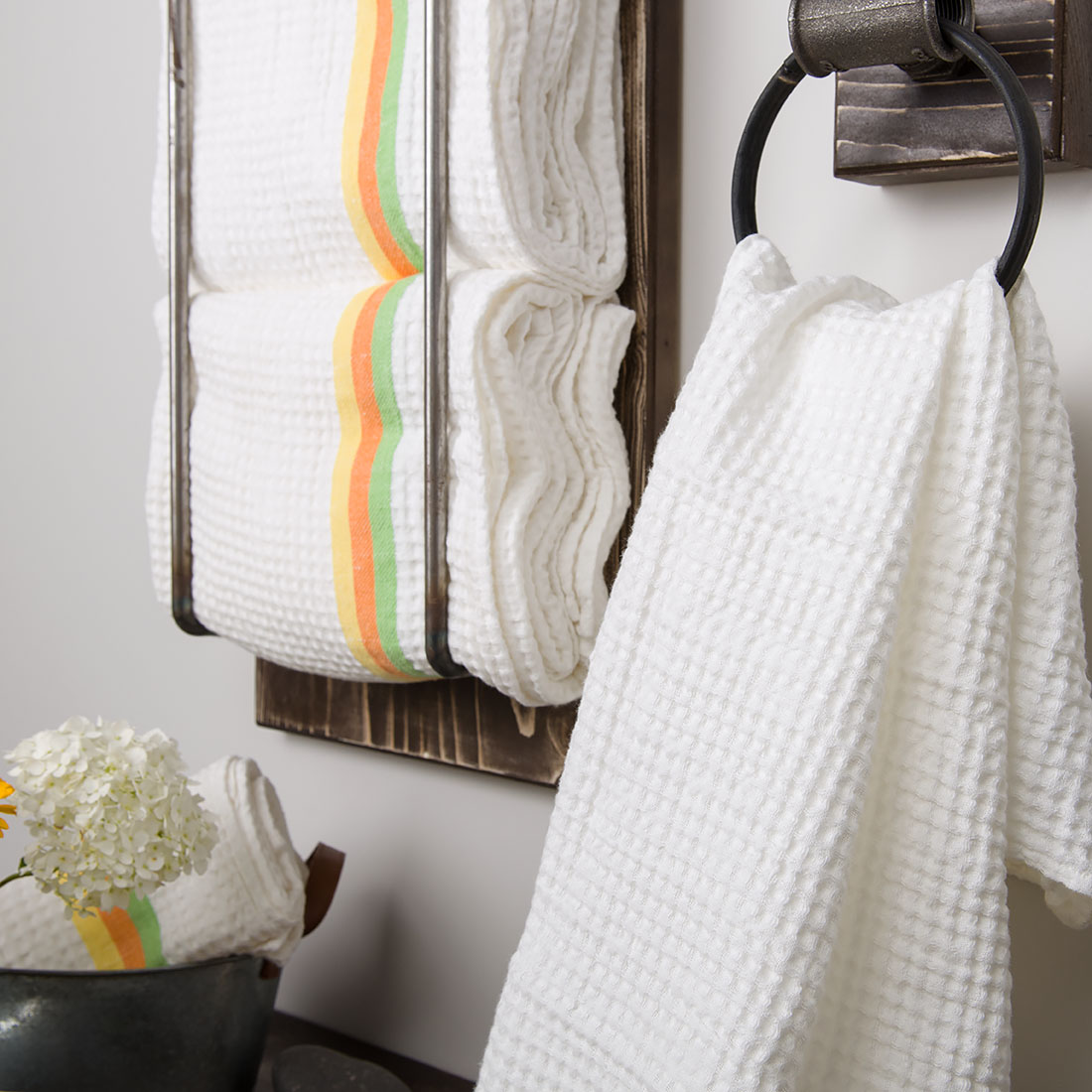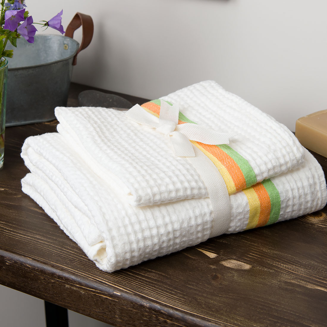 Lniano - bawełniany biały ręcznik kąpielowy wyposażony w pętelkę do zawieszania. Obydwa boki większego ręcznika (100cm x 150cm) i tylko jeden bok mniejszego (50cm x 70cm) zdobią kolorowe pasy wytkane w zielono-pomarańczowo-żółte skośne prążki. Tkanina, z której został uszyty ręcznik, została poddana praniu, dlatego puszysty (wytkany w wypukły, duży waflowy wzór) ręcznik cudownie spełnia swoje zadania: świetnie wchłania wodę, szybko wysycha, jest miękki i przytulny.