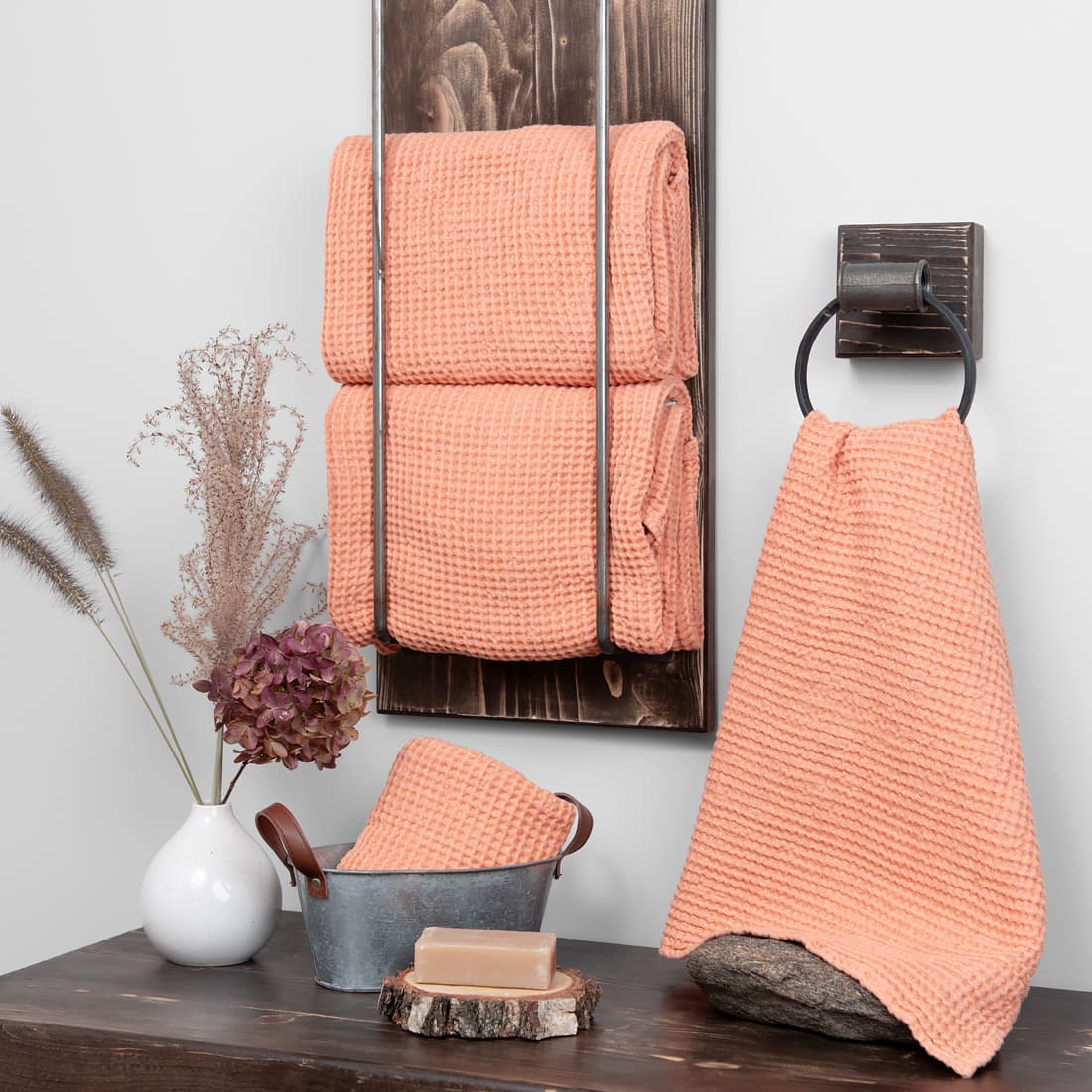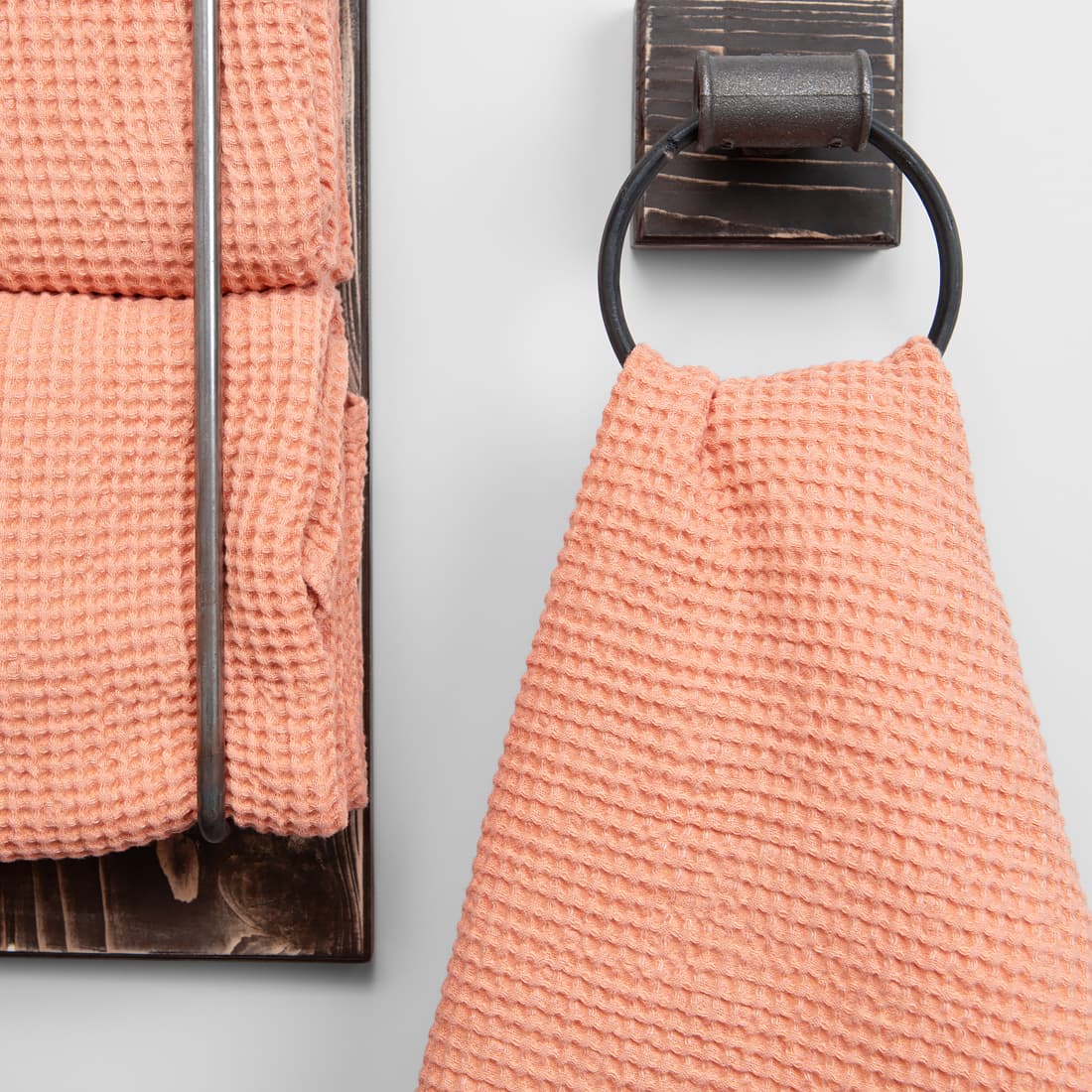 - Szczegóły: pętelka – zawieszka. Komplet ręczników jest ozdobnie przewiązany szeroką wstążeczką