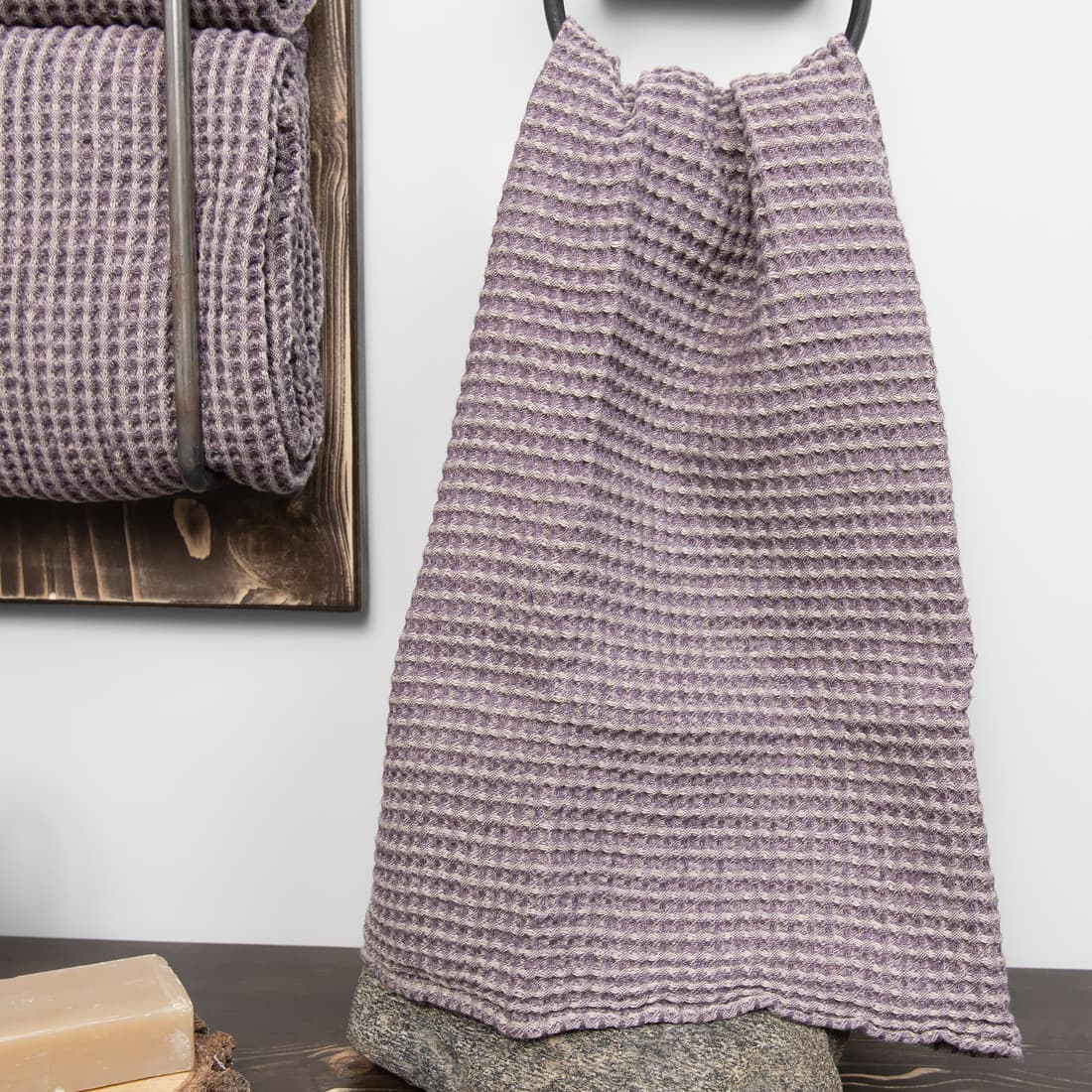 - Kolor: wytkany w melanżu z szarej w piasek i ciemnej fioletowej przędzy