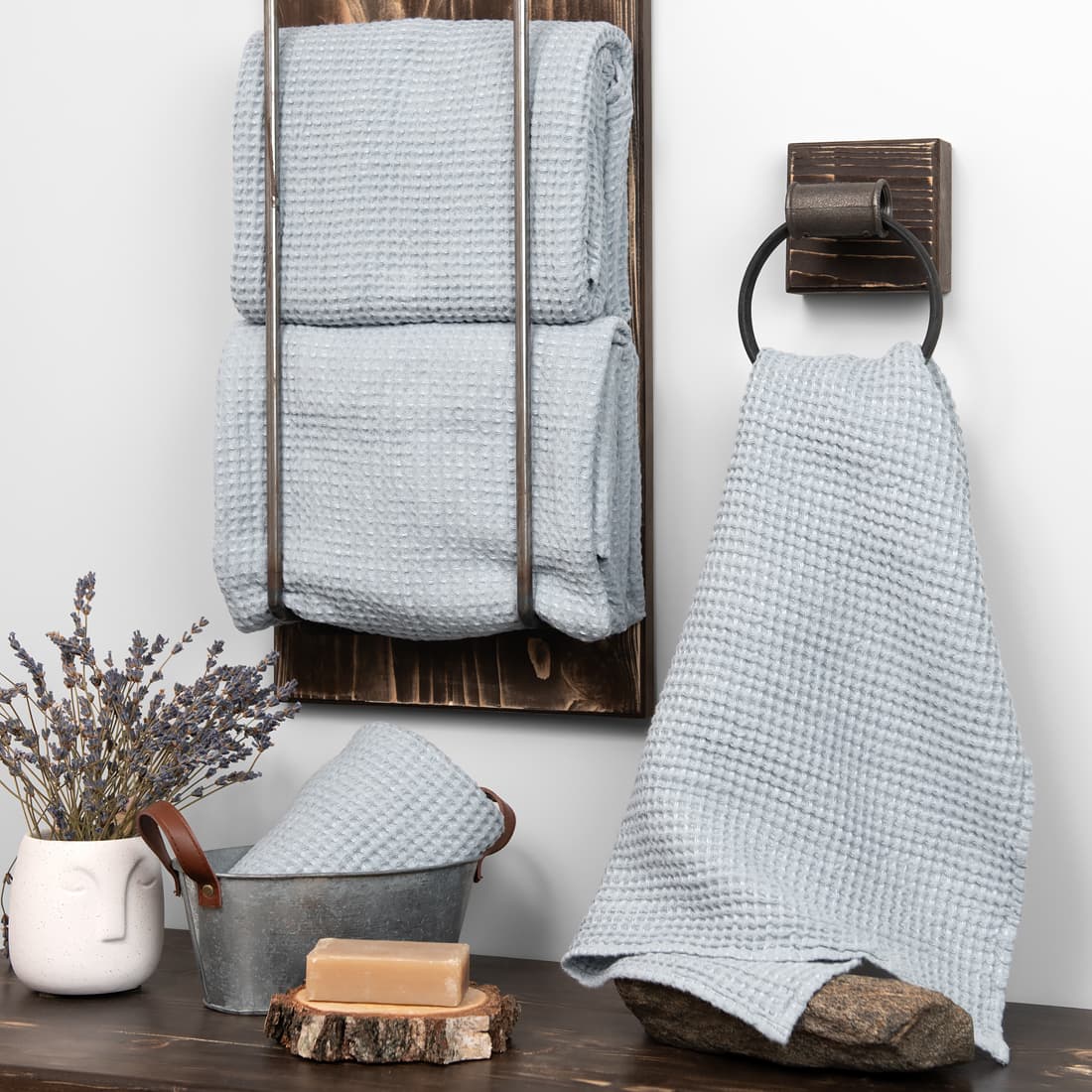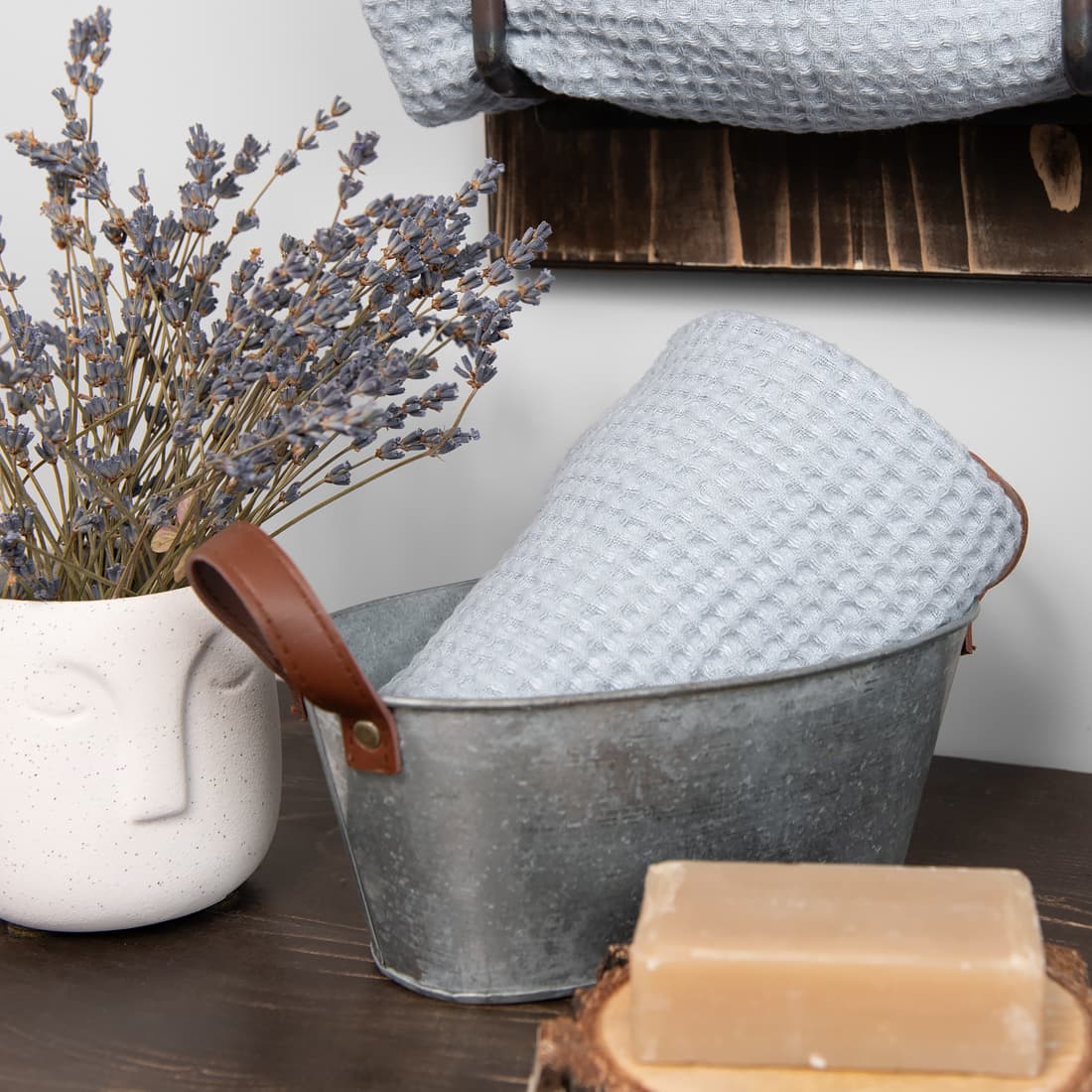 - Szczegóły: pętelka – zawieszka. Komplet ręczników jest ozdobnie przewiązany szeroką wstążeczką