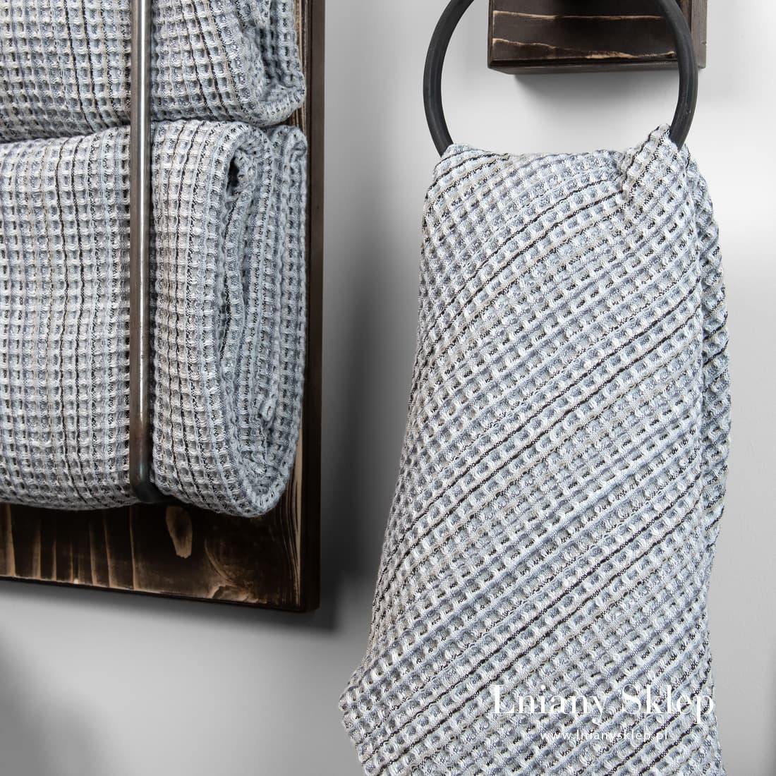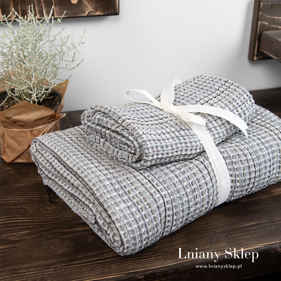 BINGO szary ręcznik z tkaniny wytkanej z przędzy lnianej i bawełnianej piaskowej i białej oraz o kilku odcieniach szarego i niebieskiego. Po praniu wytkane splotem waflowym okienka stały się wypukłe, są duże, przypominają gofry. Wybierz komplet dwóch ręczników w tonacji świeżej, wiosennej zieleni: kąpielowy i do wycierania rąk. Komplet przewiążemy ozdobną białą wstążeczką. Sympatyczny i praktyczny prezent!