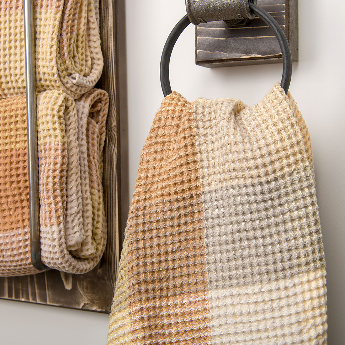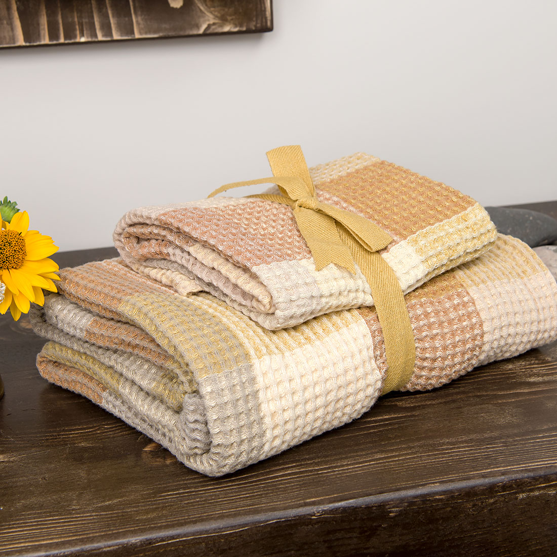 Jeżeli marzysz owinąć się po kąpieli bajecznie miękkim i przytulnym ręcznikiem kąpielowym – to akurat na taki trafiłeś. Wytkany w pastelową piaskowo-karamelową kratkę lniano-bawełniany ręcznik został poddany specjalnemu praniu, dzięki któremu stał się szczególnie przyjazny delikatnemu ciału. Delikatny wypukły wzór, przypominający plaster miodu, wygodna pętelka do zawieszania jeszcze bardziej uatrakcyjniają ręcznik. Jeżeli poszukujesz pomysłu na prezent, to nasz komplet dwóch mięciutkich, naturalnych ręczników może stać się tym udanym wyborem. Można rozbić komplet i nabyć tylko jeden z ręczników.