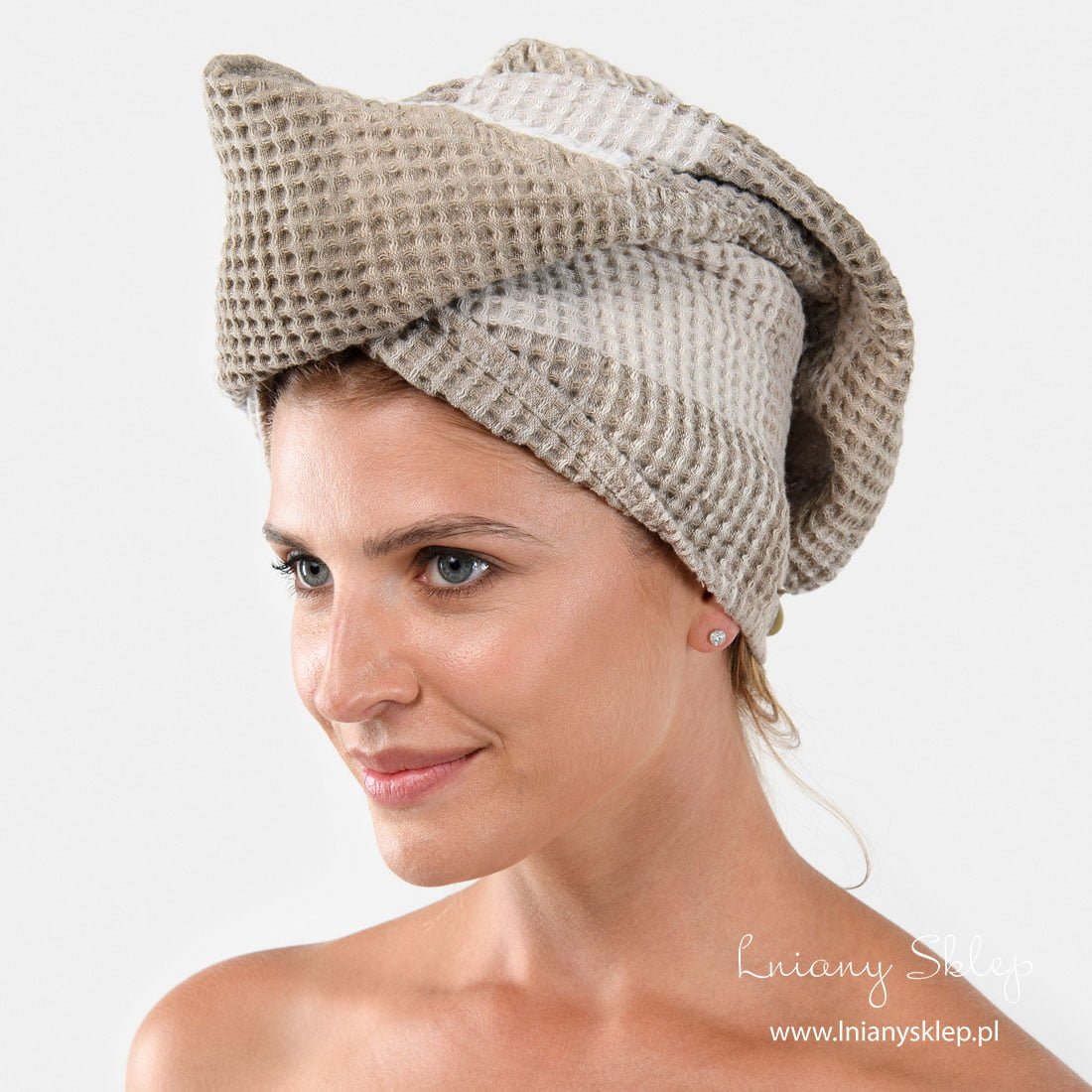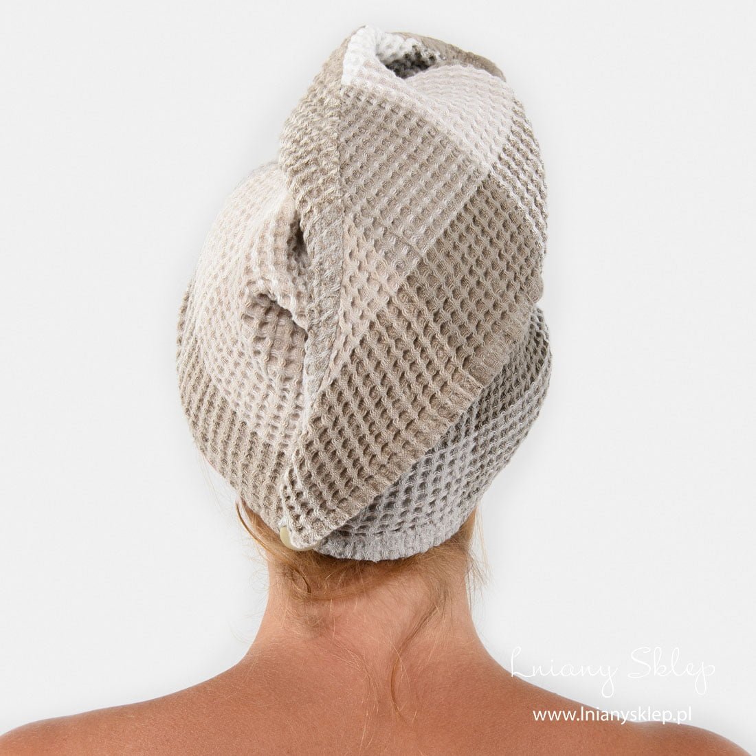 Czapeczka do sauny na guziczku z pranej, a więc mięciutkiej lniano – bawełnianej tkaniny wytkanej splotem waflowym w biało - piaskową kratkę. Czapeczka zapięta z tyłu na guziczek przytrzyma niesforne mokre włosy i wchłonie wilgoć.