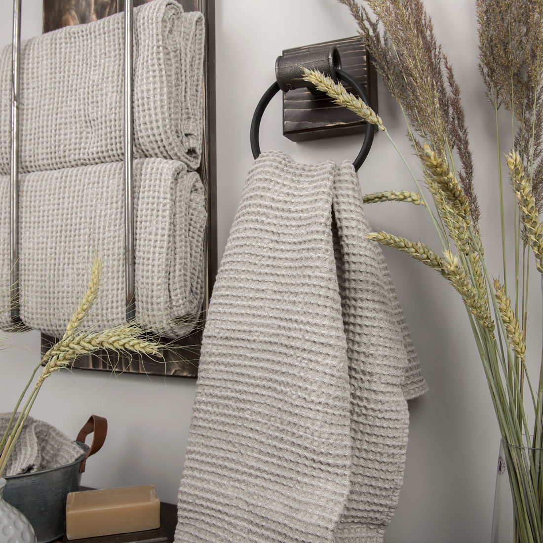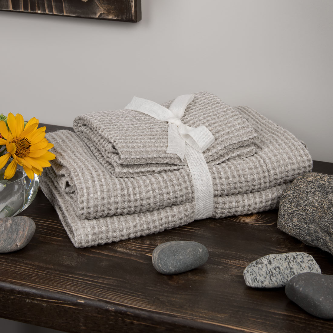 Duży, przytulny ręcznik z naturalnej zmiękczanej tkaniny lnianej, wzór waflowy. Posiada pętelkę do zawieszania. Ręcznik świetnie wchłania wodę, masuje skórę.