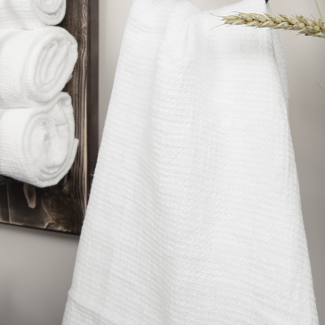 Jakościowy, śnieżnobiały, przytulny ręcznik z pranej tkaniny lnianej wytkanej we wzór waflowy. Naturalny ręcznik dobrze wchłania wodę, świetnie się sprawdzi w łaźni oraz w codziennej kąpieli.