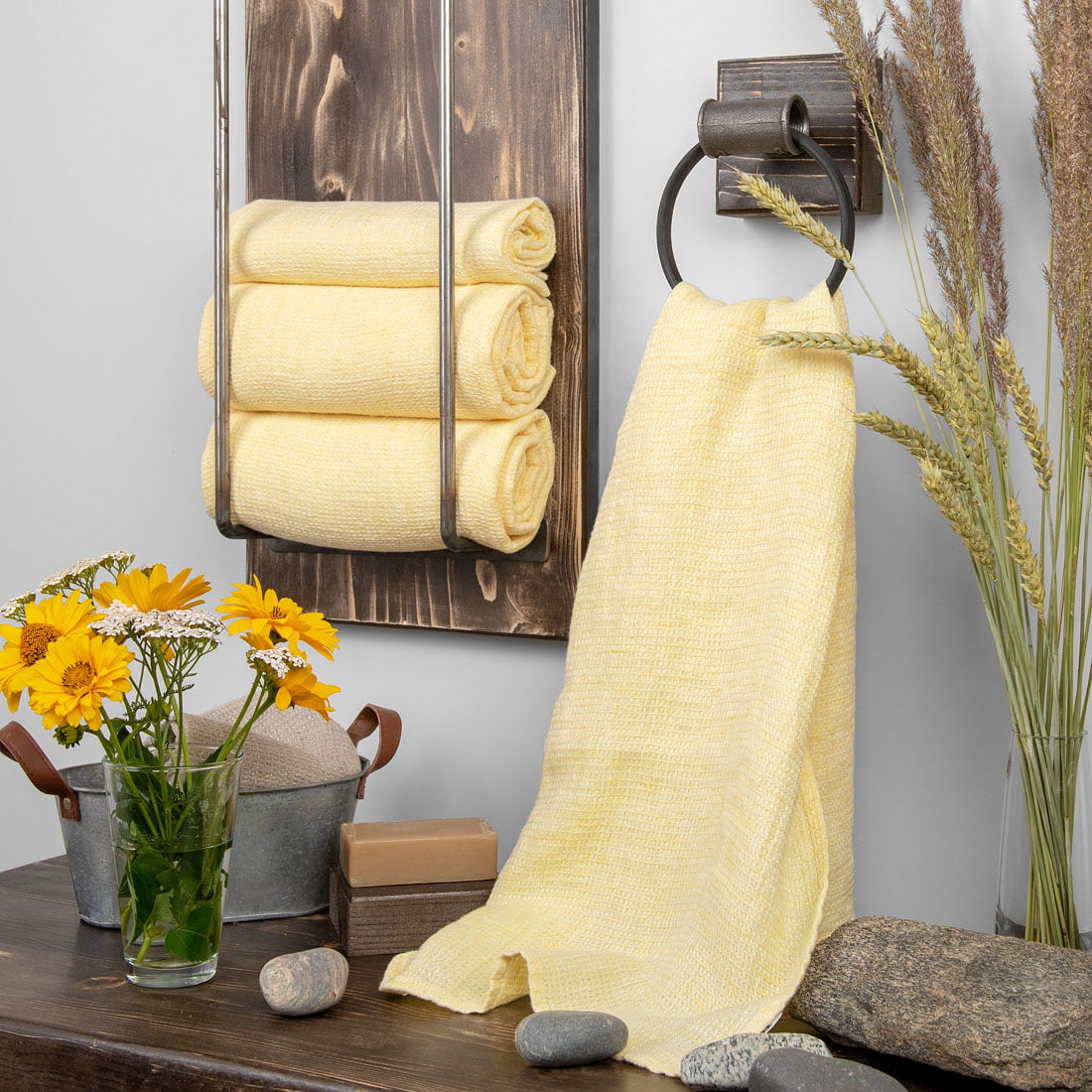 Lniany, żółty, „waflowy” ręcznik kąpielowy. Ręcznik z poddanej praniu w procesie produkcji tkaniny wytkanej z przędzy żółtej i białej jest mięciutki i przyjemny w dotyku. Świetnie wchłania wodę – wypróbuj!