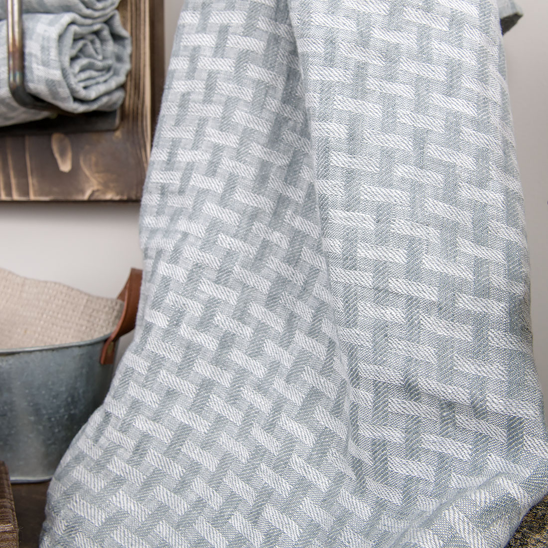 Lniany ręcznik kąpielowy wytkany w geometryczny rysunek z szarej o niebieskawym odcieniu przędzy. Tkanina, z której uszyto ręcznik, jest mięciutka, ponieważ w procesie produkcji została poddana praniu. Ręcznik ozdobiony „wyplecionym” wzorem, ładnie się będzie prezentował w łazience.