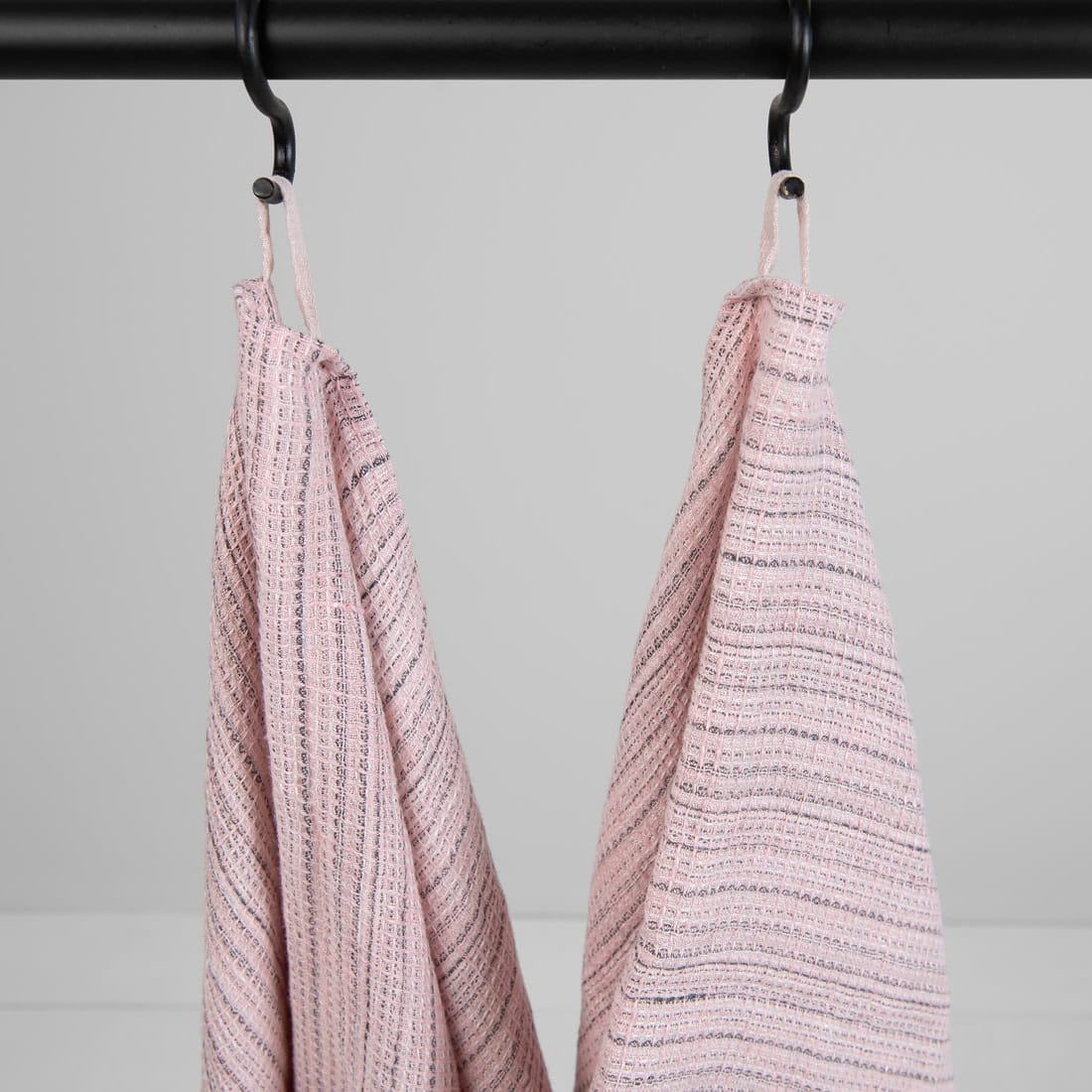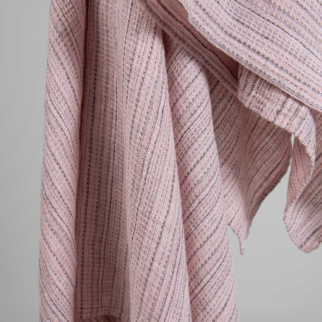 - Wzór: wytkany splotem waflowym, ozdobiony paskami