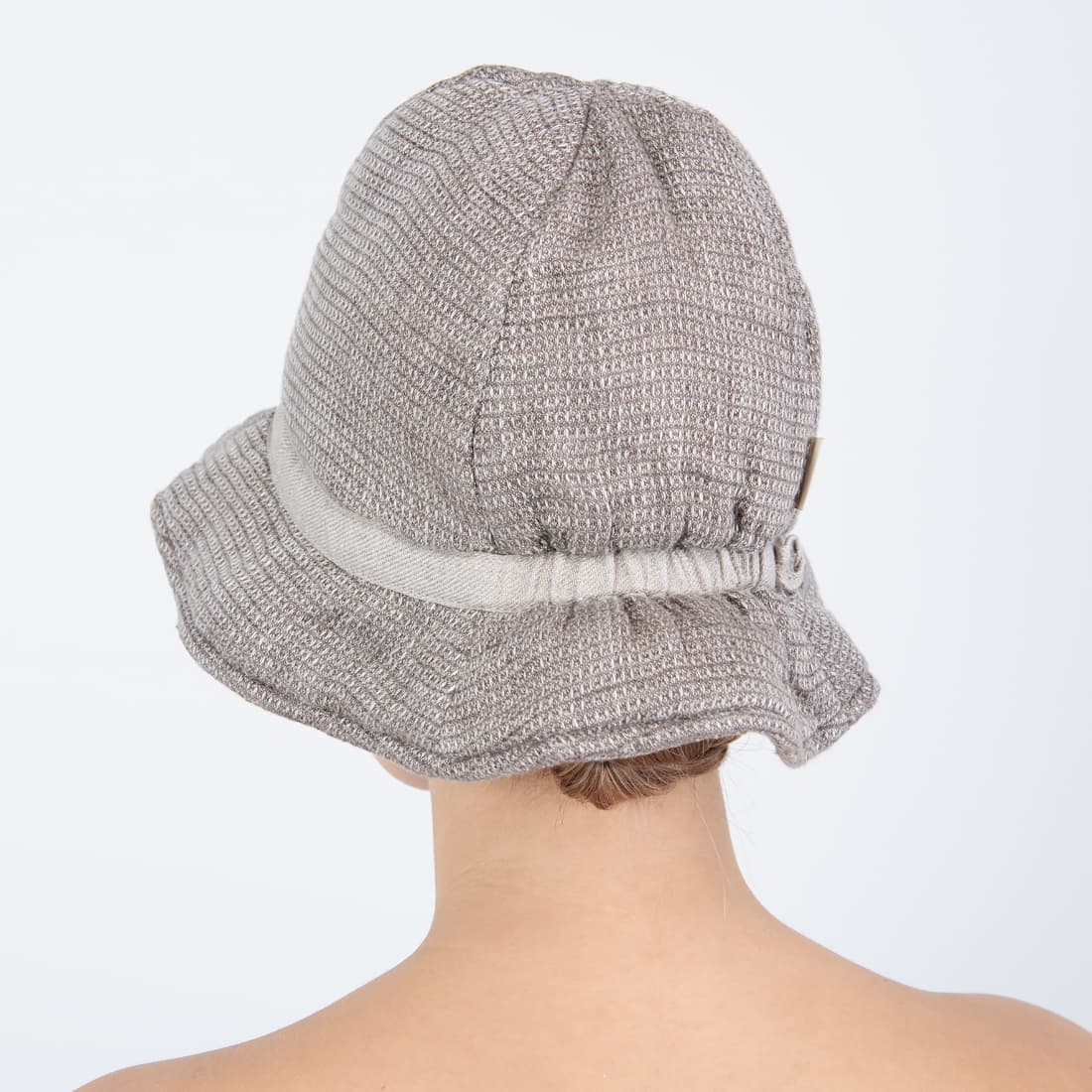 - Szczegóły: szara wstążeczka dookoła, pętelka-zawieszka, z tyłu - gumka, ocieplony watoliną bawełnianą