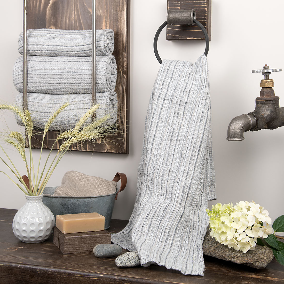 Lniany szary w drobne paski ręcznik kąpielowy.