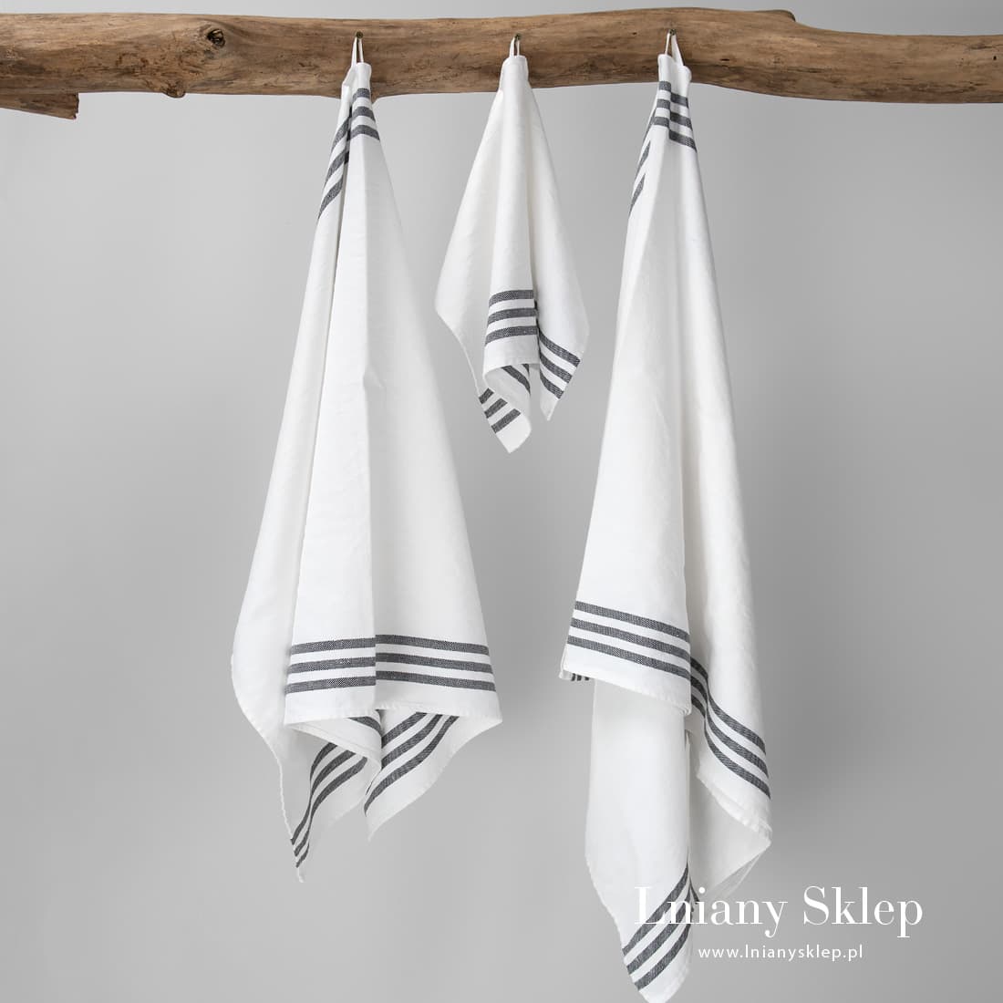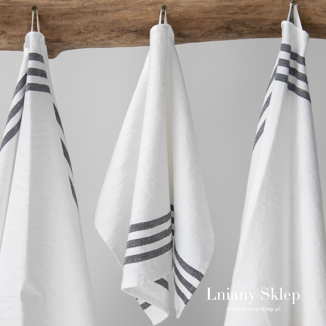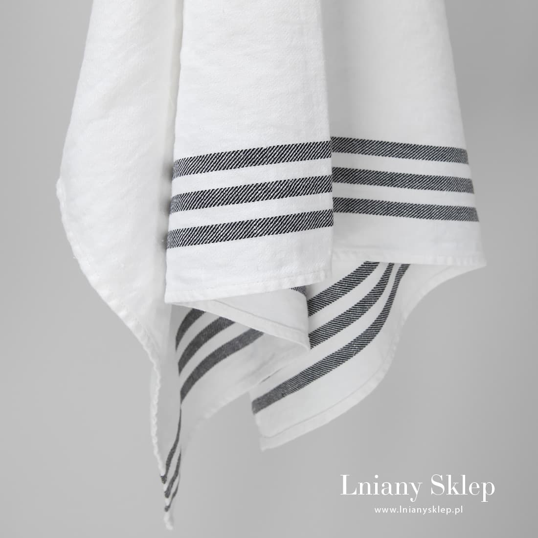 Biały ręcznik ze śnieżnobiałej przędzy wytkany splotem skośnym, a na brzegach - w czarne paski. Tkanina, z której uszyto ręcznik była poddana praniu – ręcznik jest mięciutki i przyjemny w dotyku, świetnie wchłania wodę, szybko schnie – wypróbuj produkt 100% lniany. Ręczniki dostępne w trzech rozmiarach. Można je nabyć osobno albo w komplecie – komuś miłemu na sympatyczny prezent.