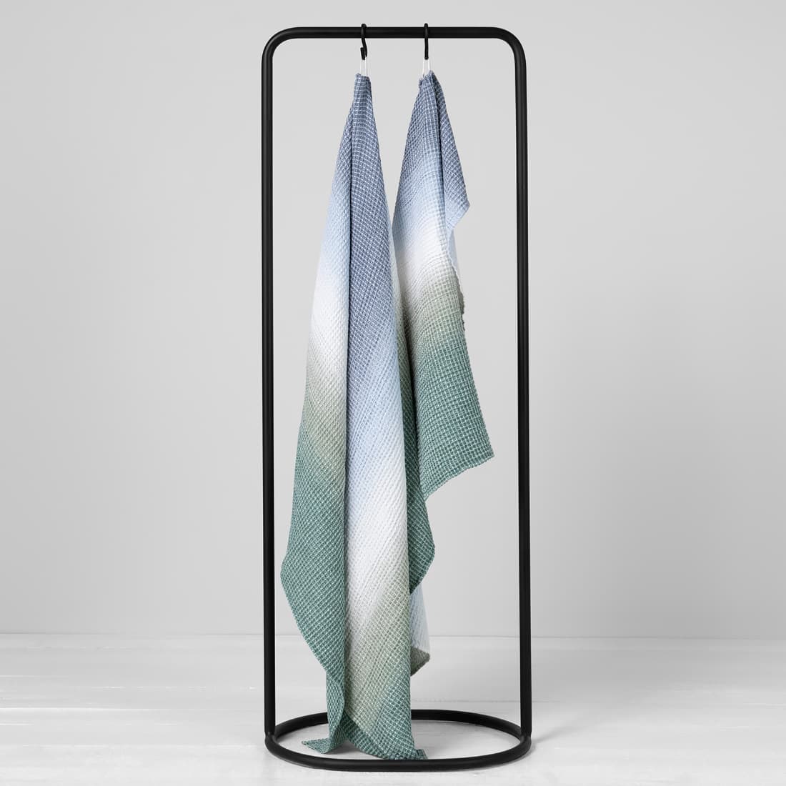- Kolor: wytkany w tęczowym melanżu z przędzy ciemnozielonej, khaki, mlecznobiałej (lekko żółtawej), niebieskiej w szarość i szarej w błękit