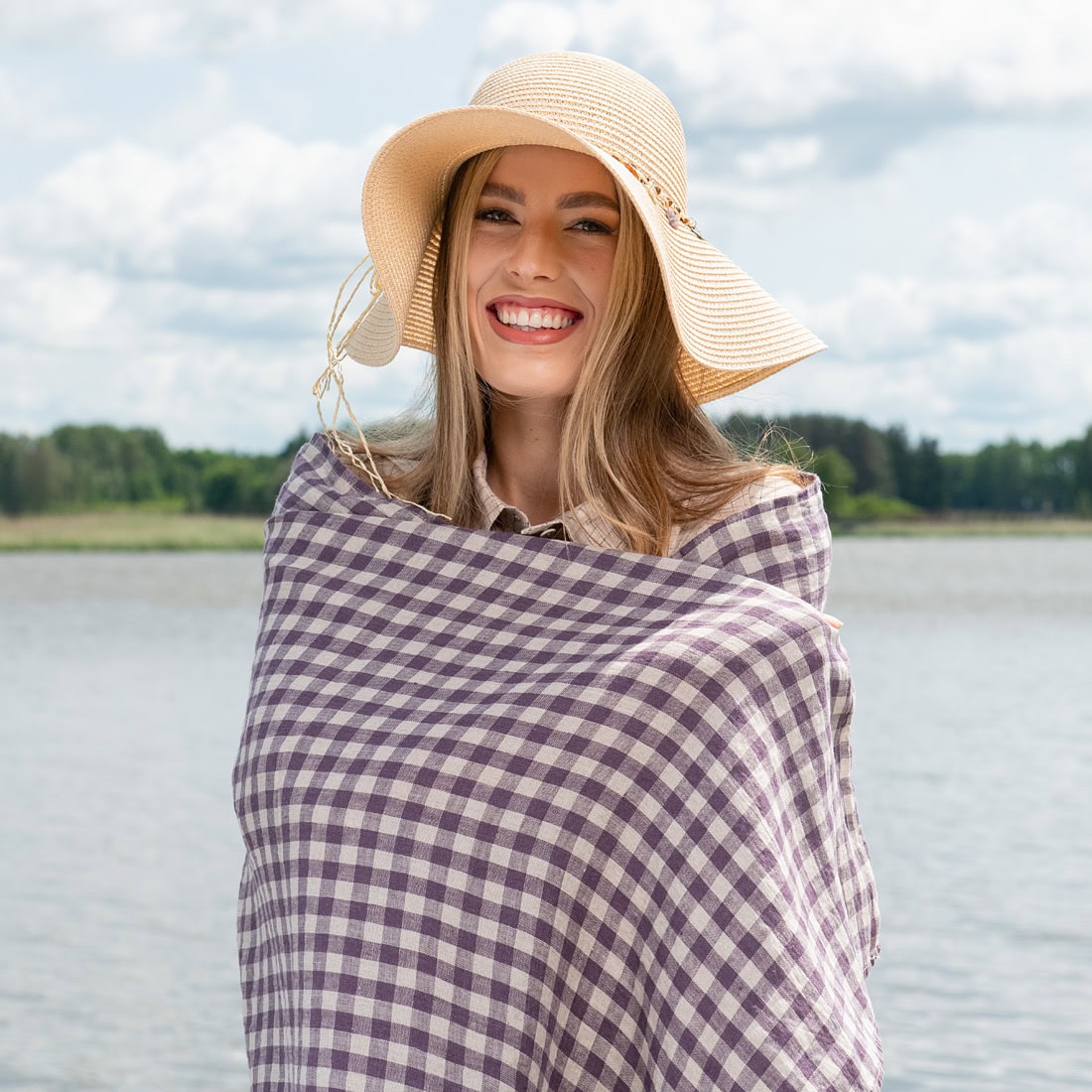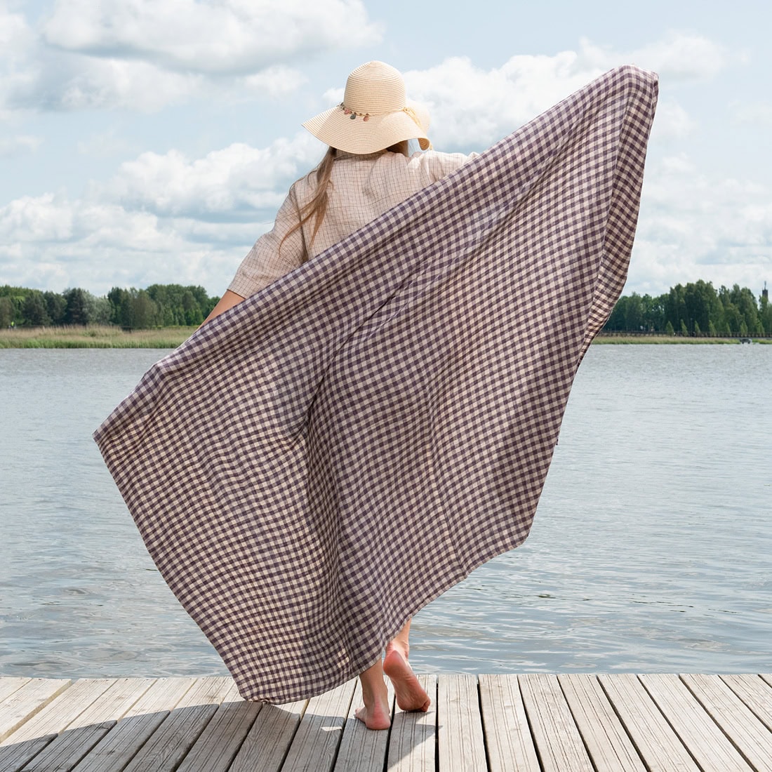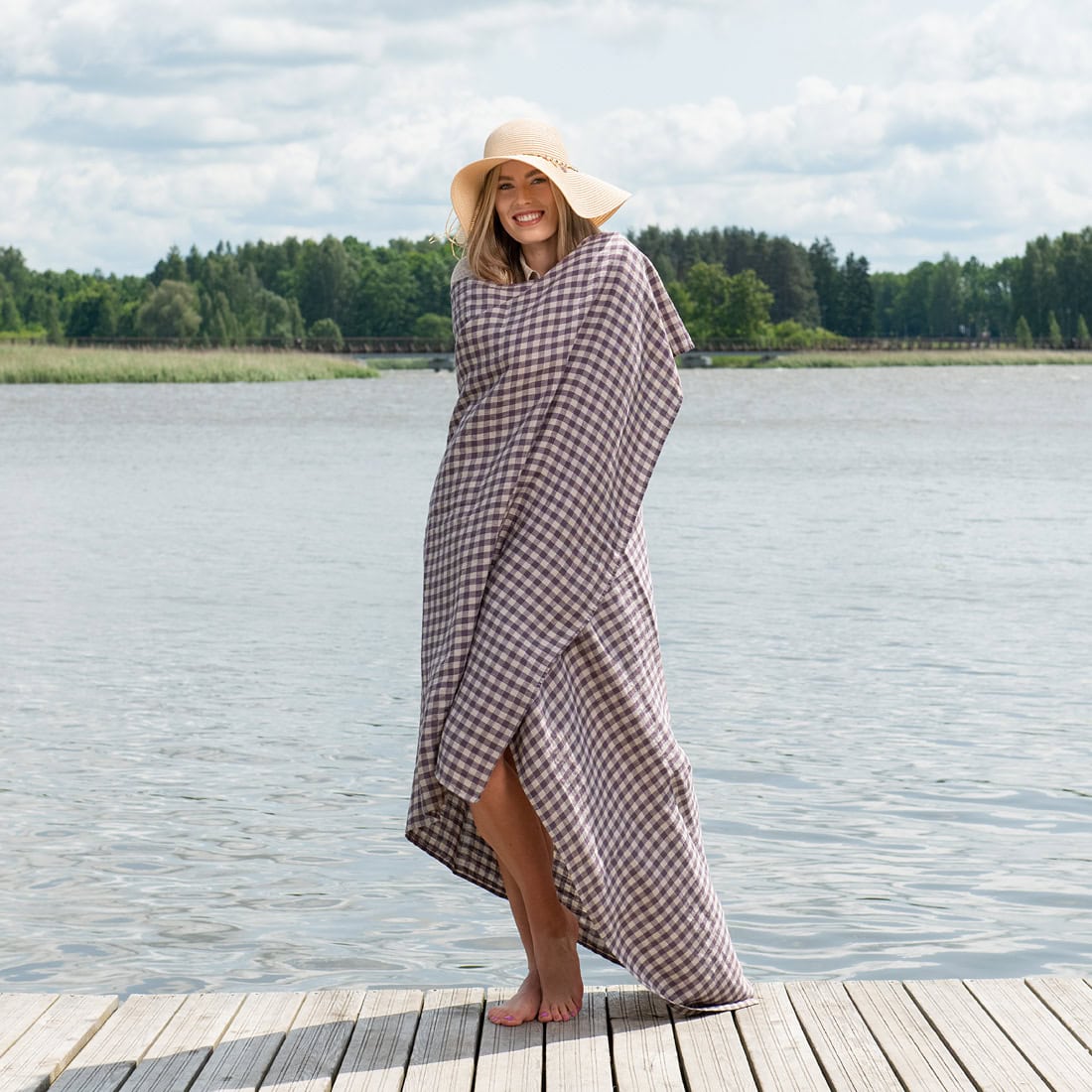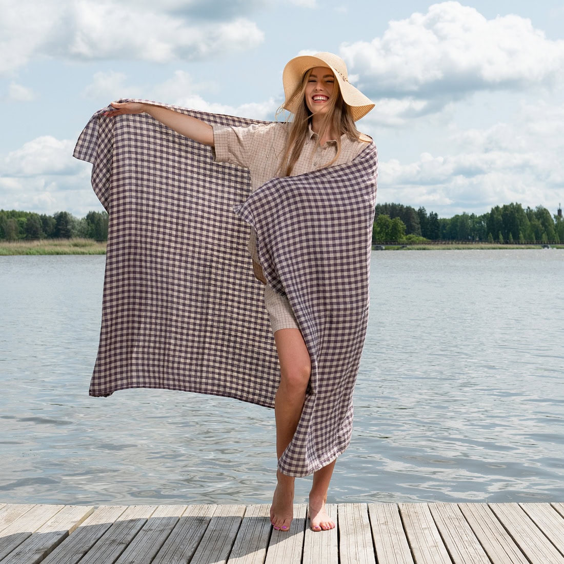 Lniany ręcznik plażowy w kratkę fioletową i piaskową (niebarwiona przędza lniana) z pranej tkaniny. Jest miękki, dobrze spija wilgoć, jest lekki, przytulnie otuli opalone ramiona. W odróżnieniu od ręczników frotte łatwo oczyścić go z piasku i w torbie podróżnej zajmie o wiele mniej miejsca. Zabierz go ze sobą na plażę!