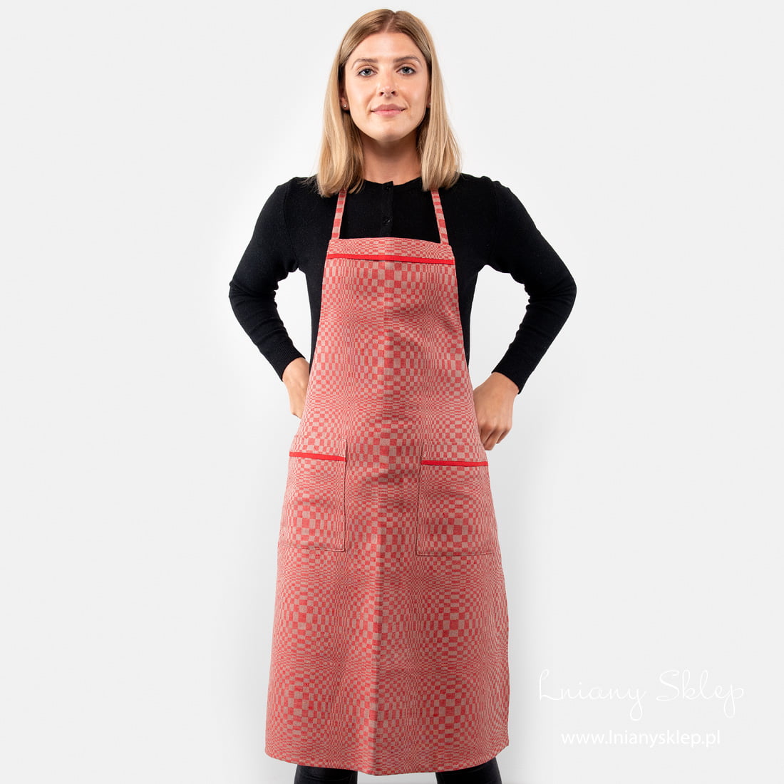 Fartuch kuchenny z lniano - bawełnianej tkaniny wytkanej w czerwono - szarą kratkę o nieregularnej wielkości. Kratka układa się w niecodzienny optyczny wzór. Dwie wygodne kieszenie z przodu fartucha oraz część fartucha pod szyją są ozdobione czerwoną lamówką. Stylowy fartuch dla stylowej gospodyni.