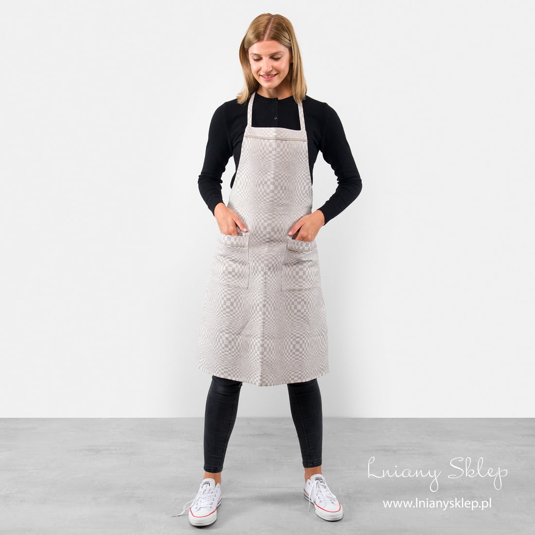 Fartuch kuchenny z lniano - bawełnianej tkaniny wytkanej w biało - szarą kratkę o nieregularnej wielkości. Kratka układa się w niecodzienny optyczny wzór. Dwie wygodne kieszenie z przodu fartucha oraz część fartucha pod szyją są ozdobione jasnoszarą lamówką. Fartuch zwolennikom jasnych barw.