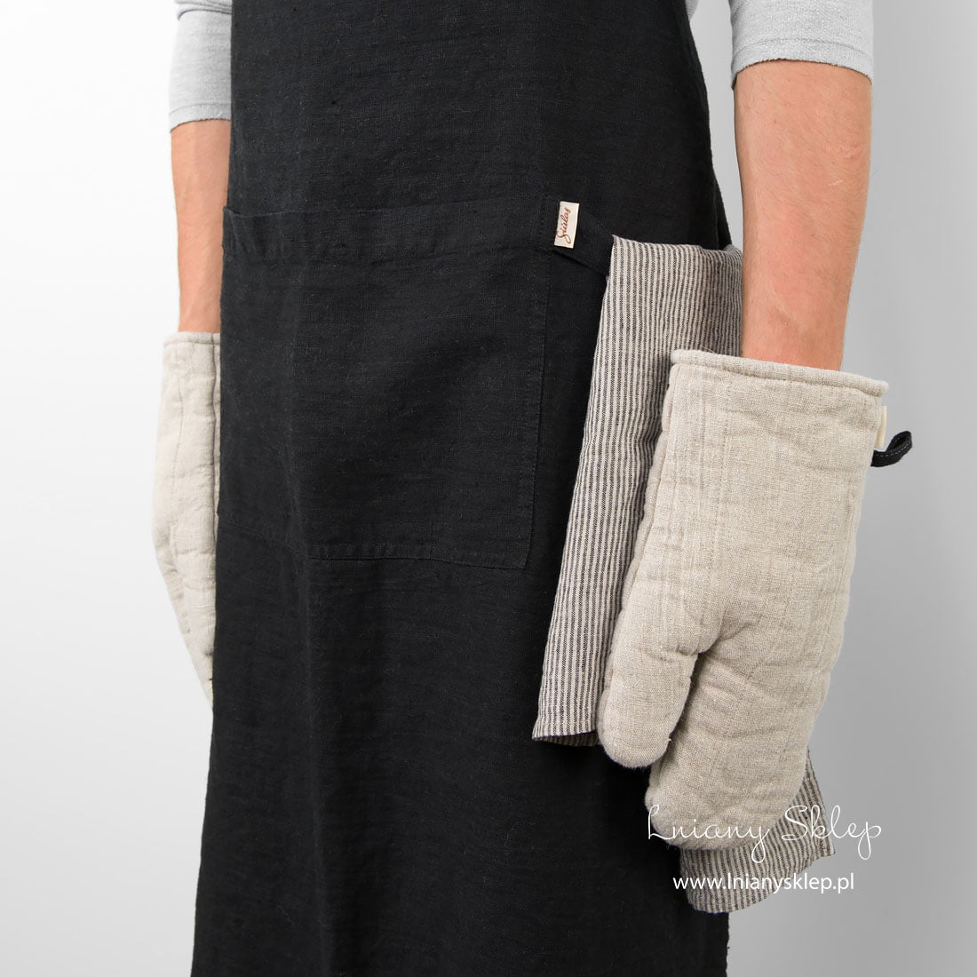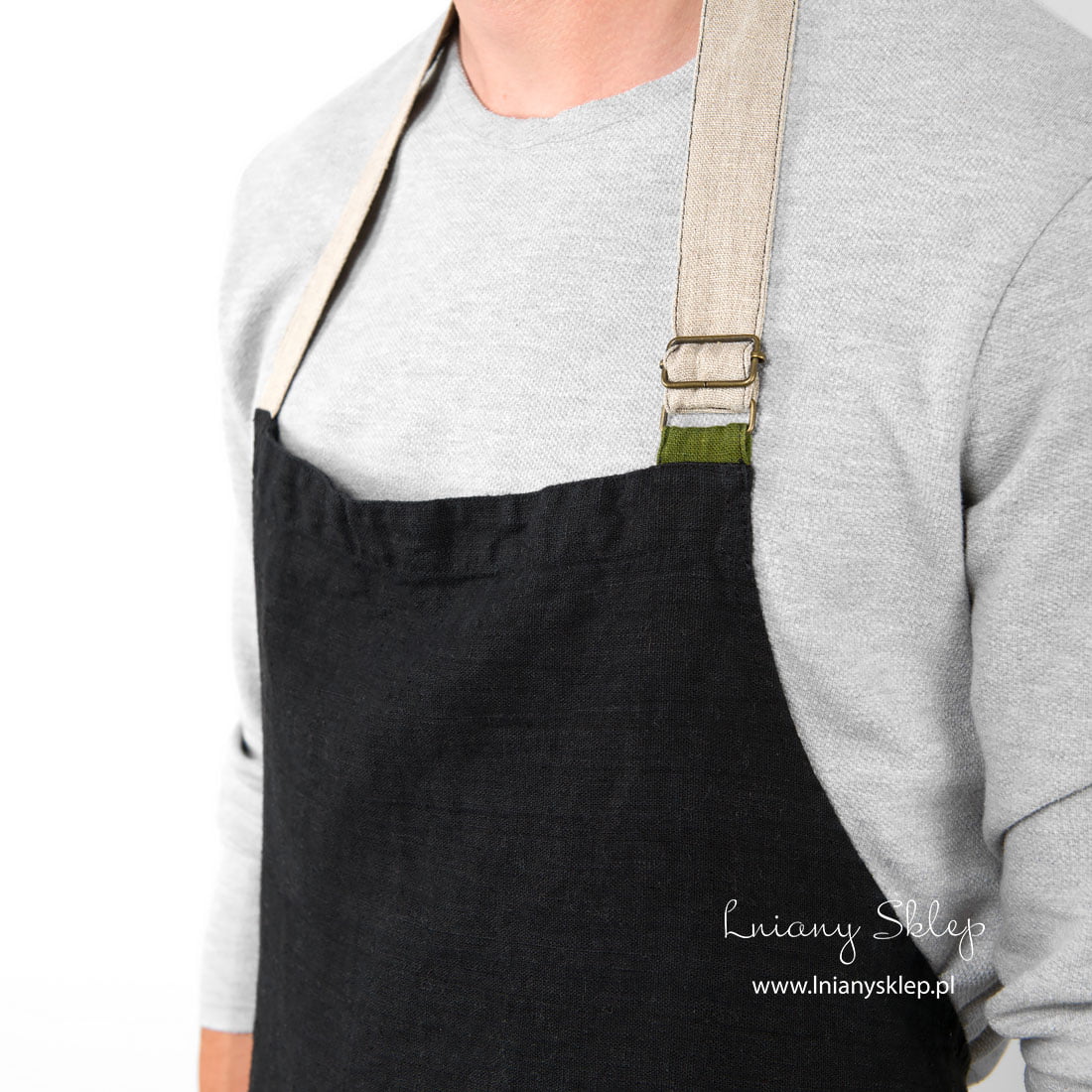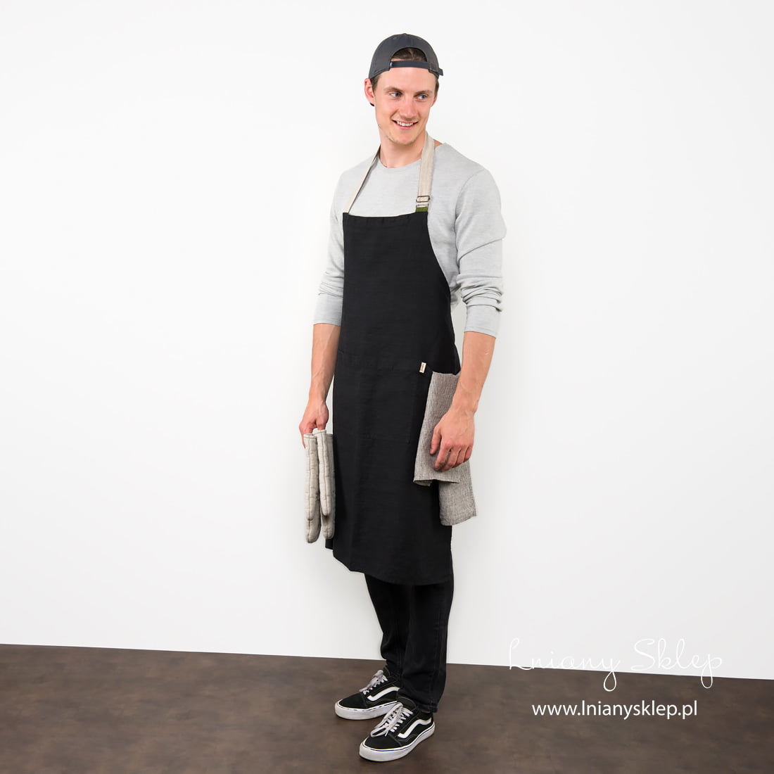 Lniany czarny fartuch z miękkiej pranej tkaniny. Dodaliśmy paski z szarej tkaniny: regulowany pasek na szyję oraz paski do wiązania w pasie. Pasek na szyję mocuje się do zielonej pętelki – mały kolorowy akcent ożywia poważną kolorystykę fartuchu. Duża kieszeń i pasek/pętla do przerzucenia ścierki kuchennej decydują o wyjątkowej funkcjonalności produktu. Czarny kolor pozwala się nie martwić o łatwe w kuchni zaplamienie się.