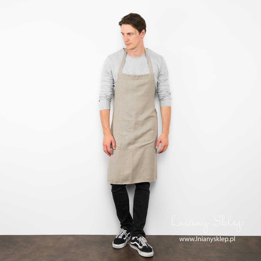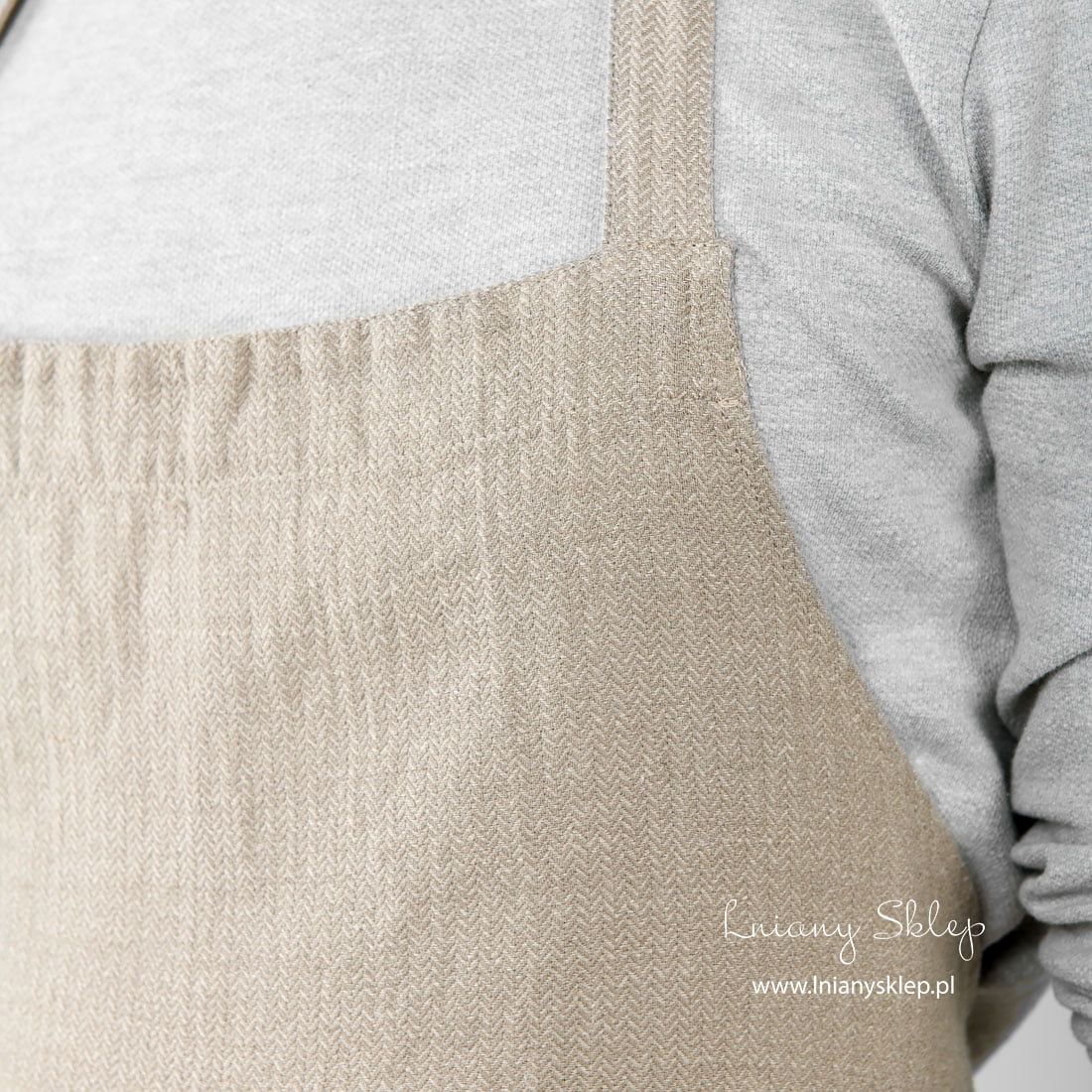Lniany fartuch szary splot jodełkowy uszyliśmy z miękkiej, pranej tkaniny lniano – bawełnianej. Fartuch z przodu ma dużą kieszeń, w której zmieści się to, co musisz mieć pod ręką – kartka z przepisem, łyżka, albo ścierka kuchenna. Jasny fartuch unisex: dla niego i dla niej.