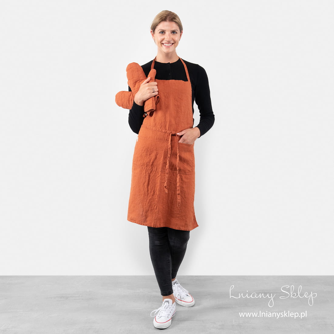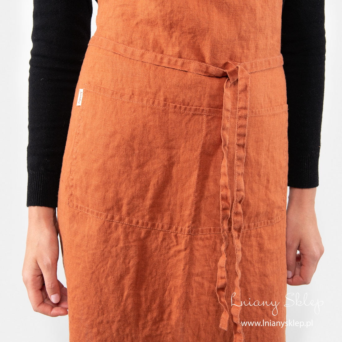 Lniany pomarańczowy fartuch kuchenny. Z przodu wyposażony w dużą, przedzieloną po środku szwem kieszeń. Szelka na szyi nie jest regulawana. Długie paski w talii można wiązać z przodu lub z tyłu. Uszyty z miękkiej, pranej tkaniny lnianej o lekko gniecionej fakturze nie wymaga prasowania. Sympatyczny i praktyczny fartuch z naturalnego lnu zawsze przyda się w kuchni.