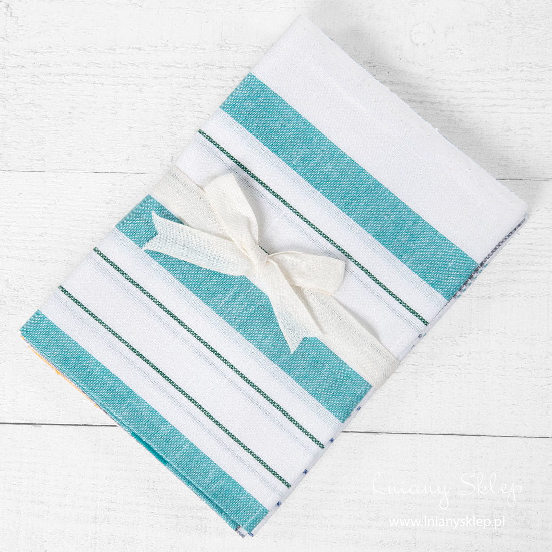 Komplet 5 ścierek kuchennych „Brzeszcze” przewiązany wstążeczką szeroką 2cm. Uszyliśmy ścierki z kompletu z tkanin lniano – bawełnianych, które świetnie się sprawdzają w kuchni: szybko wchłaniają wodę, lekko schną, łatwo je prać, można prasować.