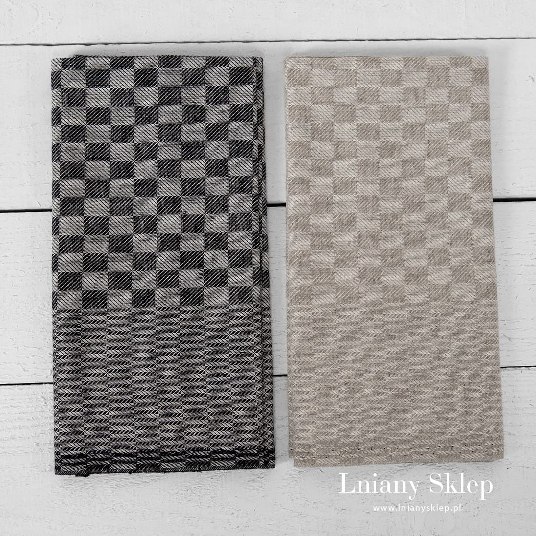 Komplet ścierek kuchennych Nr 21 – to dwie ściereczki wytkane splotem skośmym. Jedna z przędzy białej i niebarwionej (szarej o piaskowym odcieniu), druga z przędzy białej i czarnej. Ściereczki z gęsto wytkanej z włókien naturalnych tkaniny idealnie się sprawdzą w kuchni: łatwo wchłaniają wodę, pięknie się prezentują, mogą spełnić rolę miłego prezentu.