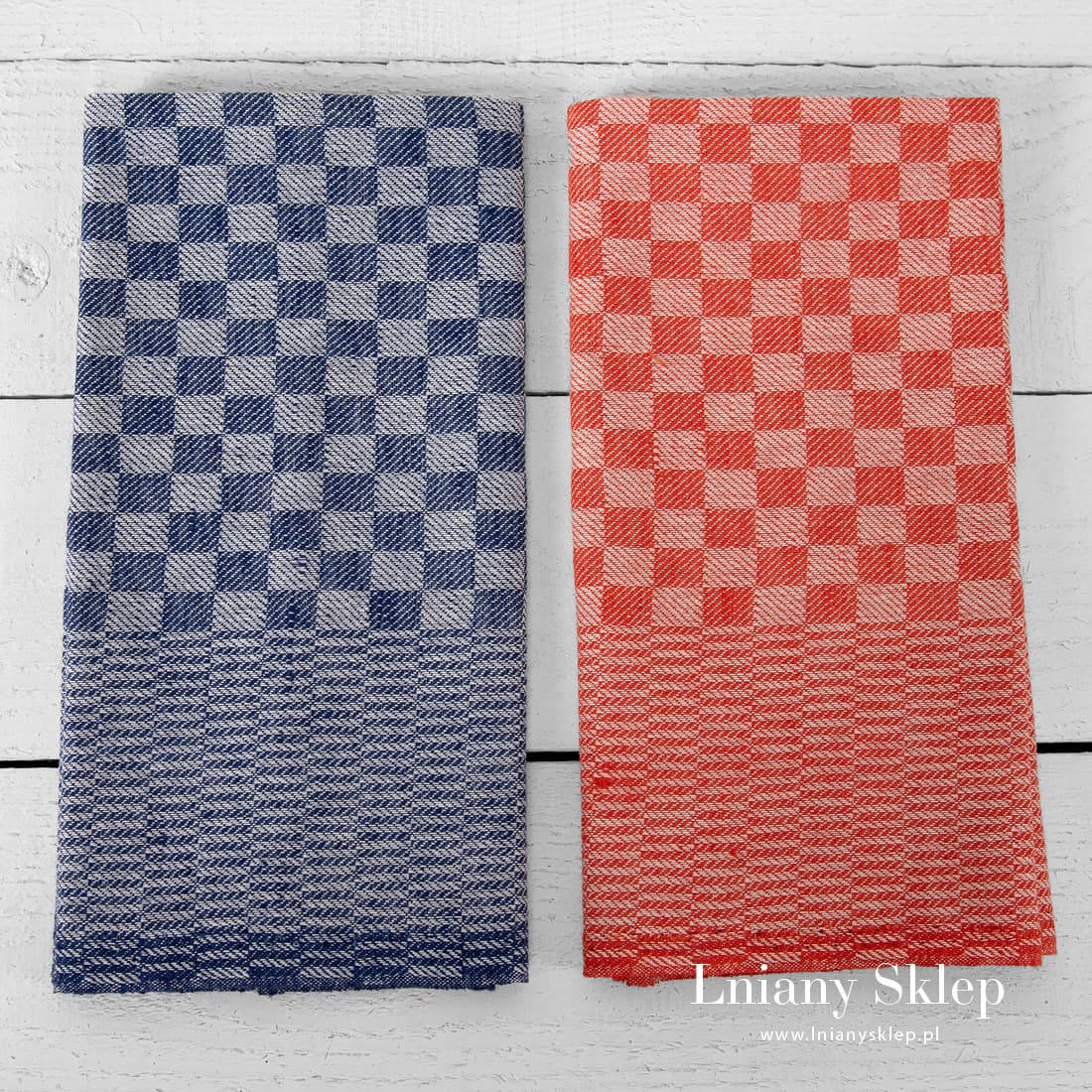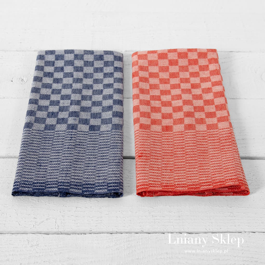 Komplet ścierek kuchennych Nr 22 – to dwie ściereczki wytkane splotem skośnym w krateczkę. Jedna z przędzy czerwonej, druga - z granatowej. Ściereczki z gęsto wytkanej z włókien naturalnych tkaniny idealnie się sprawdzą w kuchni: łatwo wchłaniają wodę, pięknie się prezentują, mogą spełnić rolę miłego prezentu.