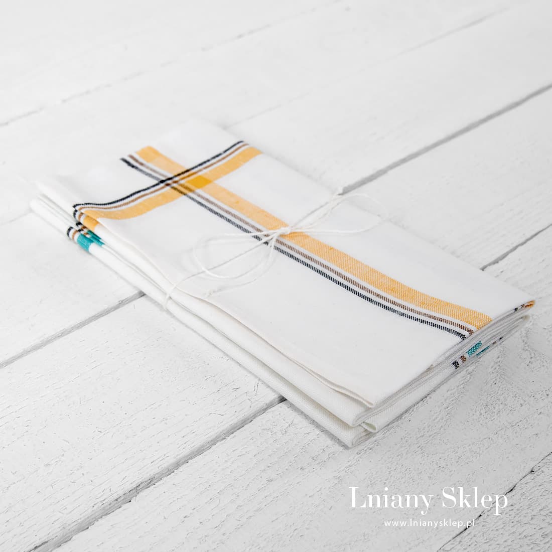 Komplet ścierek kuchennych Nr 24 – to dwie mlecznobiałe (lekko żółtawe) ściereczki ozdobione żółtymi, zielonymi czarnymi i brązowymi paskami. Ściereczki z gęsto wytkanej z włókien naturalnych tkaniny idealnie się sprawdzą w kuchni: łatwo wchłaniają wodę, pięknie się prezentują, mogą spełnić rolę miłego prezentu.