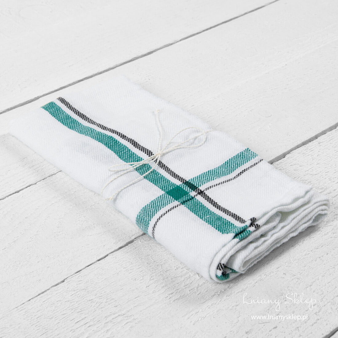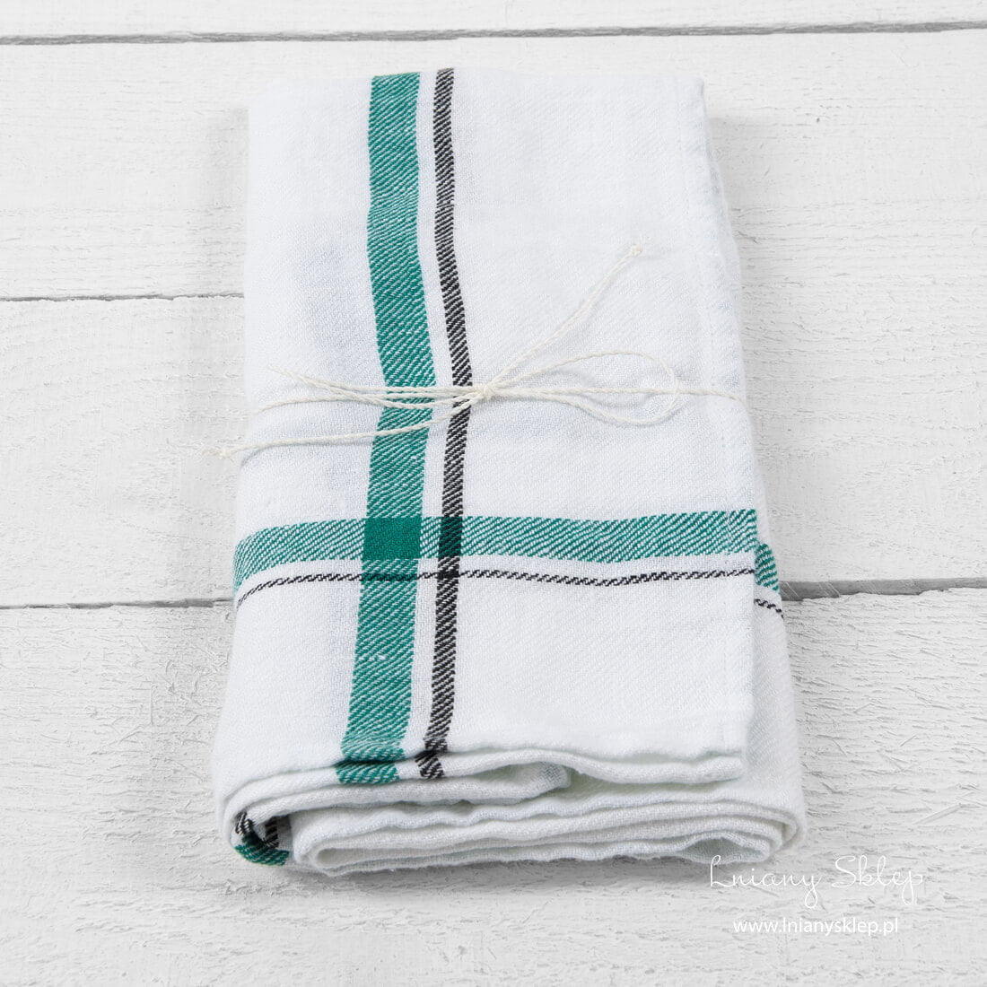Lniana ścierka kuchenna w zieloną kratę z pranego lnu wytkanego splotem skośnym z przędzy śnieżnobiałej, zielonej i czarnej. Prany len świetnie się sprawdzi w kuchni: lekko wchłania wodę, szybko schnie, łatwo się pierze. Szukasz praktycznego upominku? Ścierka elegancko przewiązana białym lnianym sznurkiem – ładnie się prezentuje.