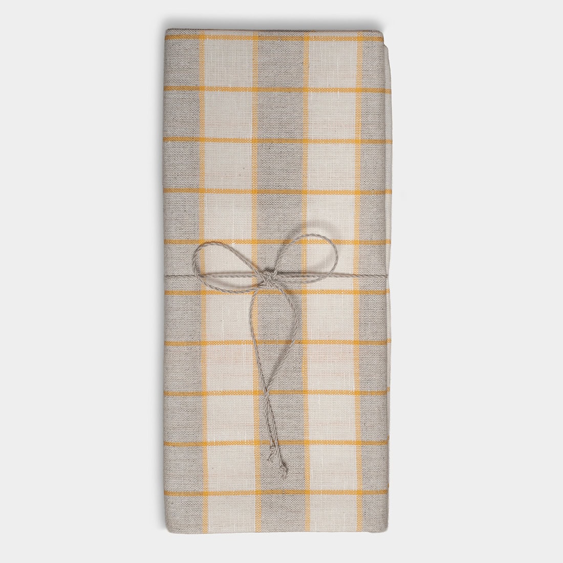 Lniano – bawełniany ręcznik kuchenny wytkany w biało - szaro - żółtą kratkę. Ręczniczek przewiązano lnianym sznureczkiem. Duży (70cm x 70cm) ręcznik kuchenny z wytrzymałej tkaniny naturalnej długo będzie wiernym pomocnikiem każdej gospodyni.