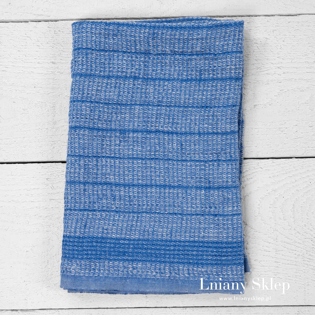 Lniana ścierka kuchenna z tkaniny wytkanej splotem waflowym z przędzy białej i niebieskiej. Tło zdobią wytkane pionowo paski. Po praniu miękka tkanina idealnie sprawdzi się w kuchni.