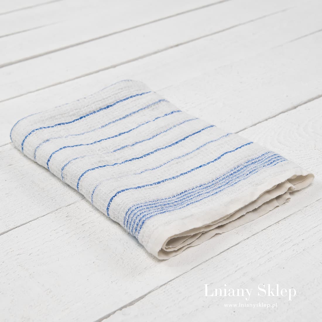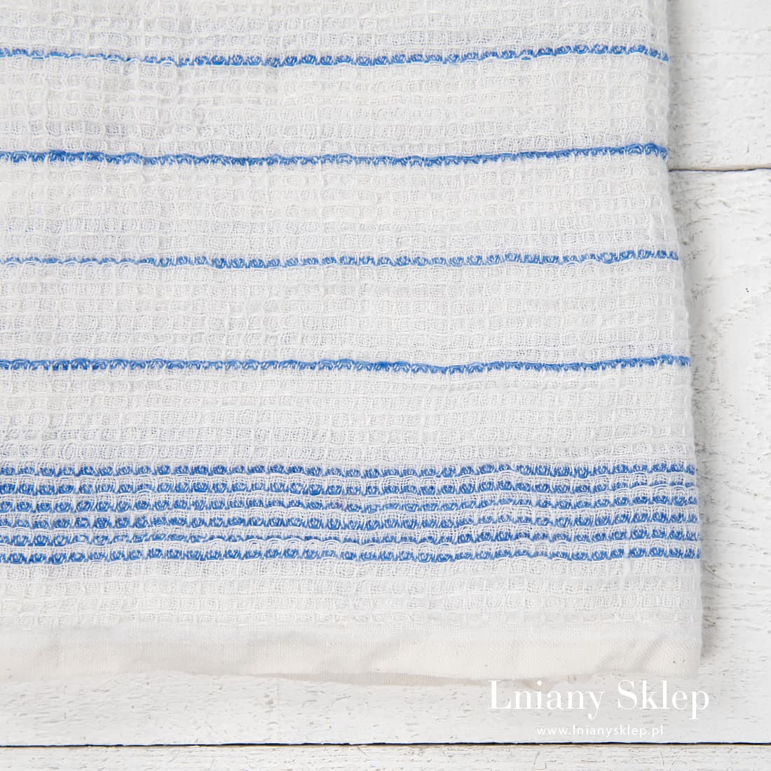 Lniana ścierka kuchenna z tkaniny wytkanej splotem waflowym. Mlecznobiałe (lekko żółtawe) tło zdobią niebieskie paski. Mocna, gęsto wytkana tkanina idealna na potrzeby kuchenne: wytrzyj naczynia, osusz ręce. Lniane ścierki z tkaniny waflowej świetnie się sprawdzą we współczesnej kuchni.