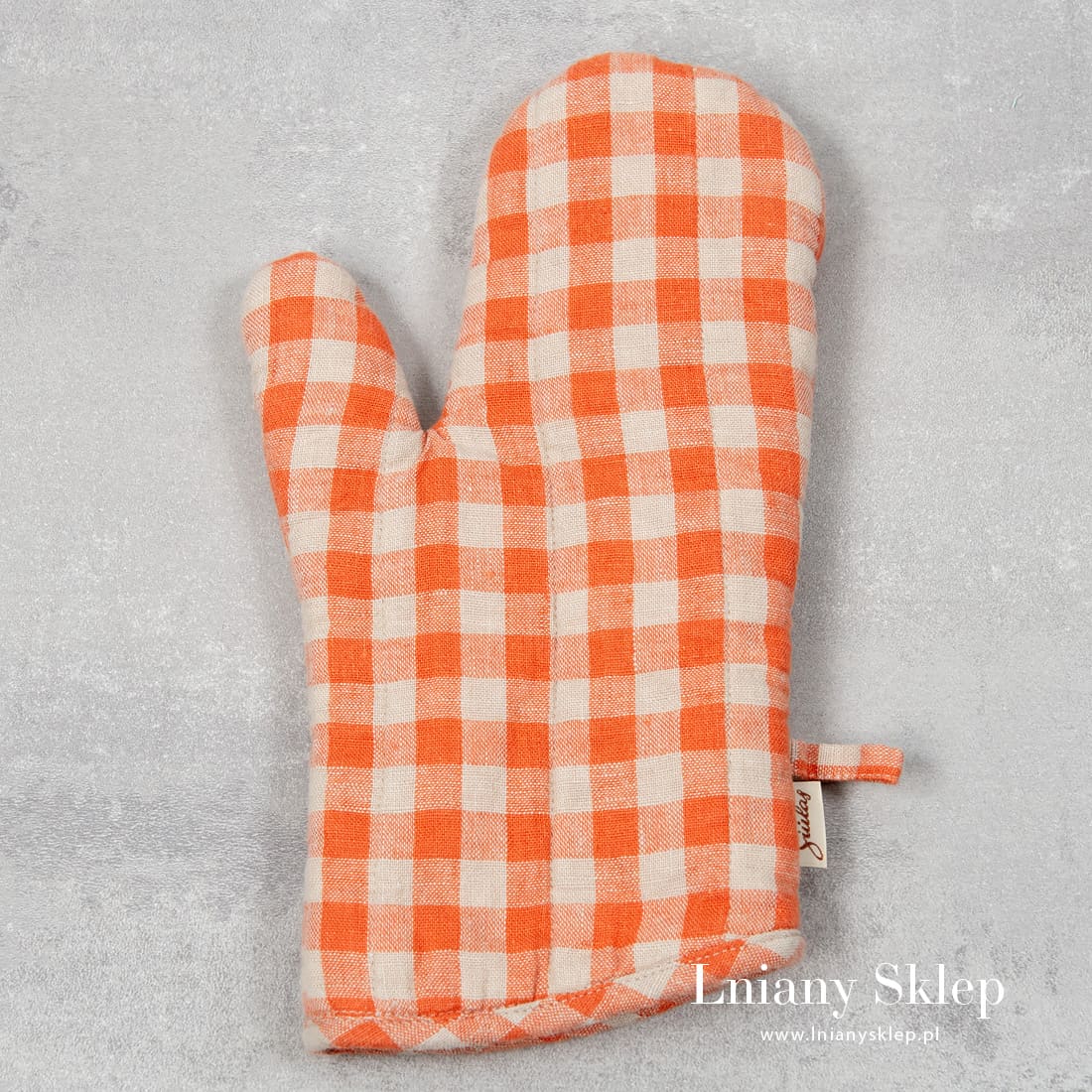 Lniana rękawica kuchenna pomarańczowa w kratkę z pranej tkaniny. Mięciutka, rękawica kuchenna ocieplona bawełnianą watoliną, by uchronić dłonie przed oparzeniem. Wyposażona w zawieszkę. Mamy lniany fartuch wykonany z identycznej tkaniny w kratkę!