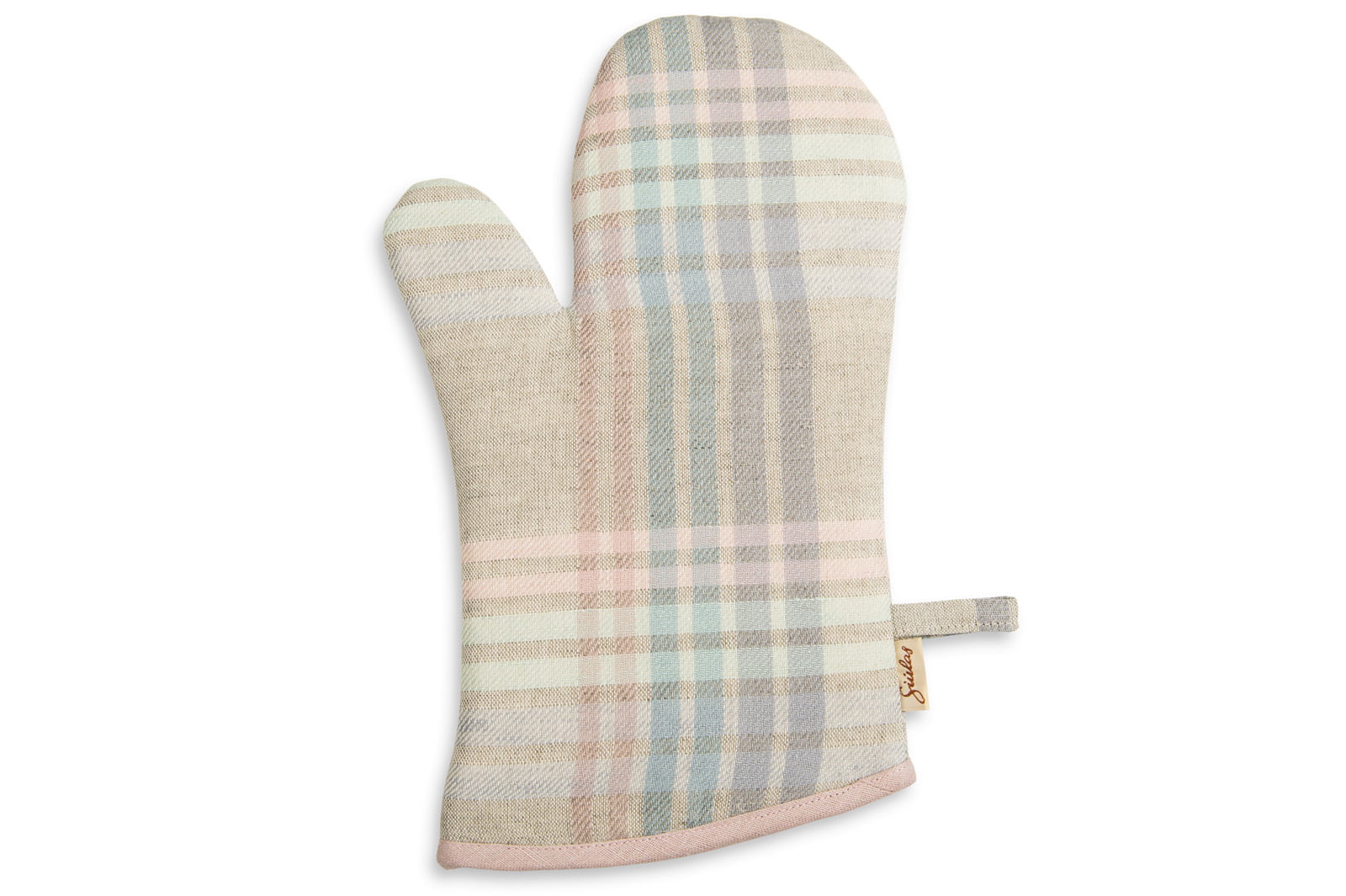 Jasna szara rękawica kuchenna z tkaniny lniano – bawełnianej wytkanej w kolorowe, pastelowe paski. Rękawica jest ocieplona watoliną, posiada wygodną zawieszkę z szarej tkaniny. Rozmiar rękawicy jest uniwersalny – pasuje na dużą albo małą dłoń.