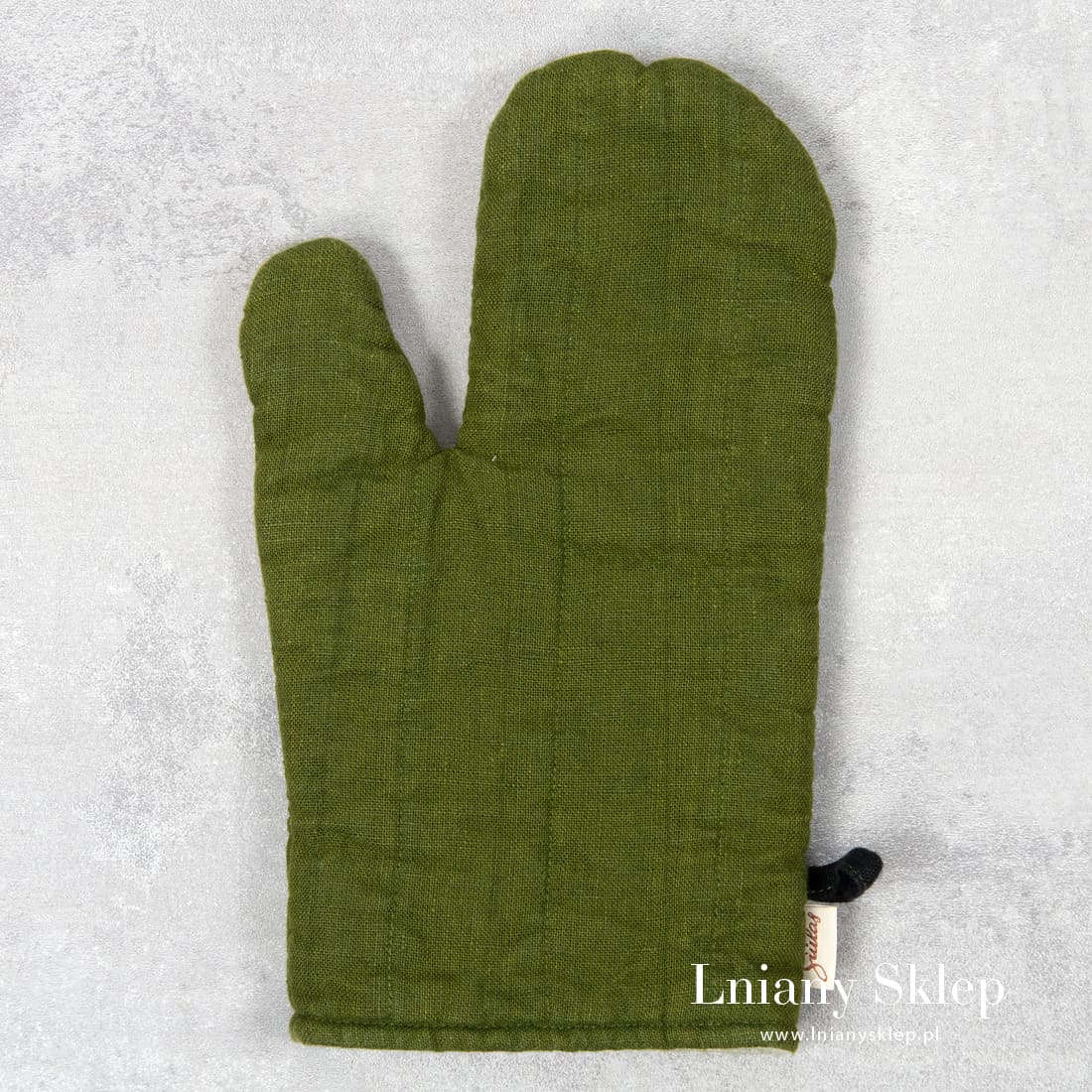 Zielona lniana rękawica kuchenna z pranej tkaniny wytkanej z przędzy 100% lnianej. Wewnętrzna warstwa rękawicy uszyta z naturalnego, niebawionego lnu. Wyposażona w zawieszkę z czarnej tkaniny. Mięciutka, rękawica kuchenna ocieplona bawełnianą watoliną, by uchronić dłonie przed gorącem. W naszej ofercie mamy zielony fartuch wykonany z identycznych tkanin: zielonej, czarnej i niebarwionej!