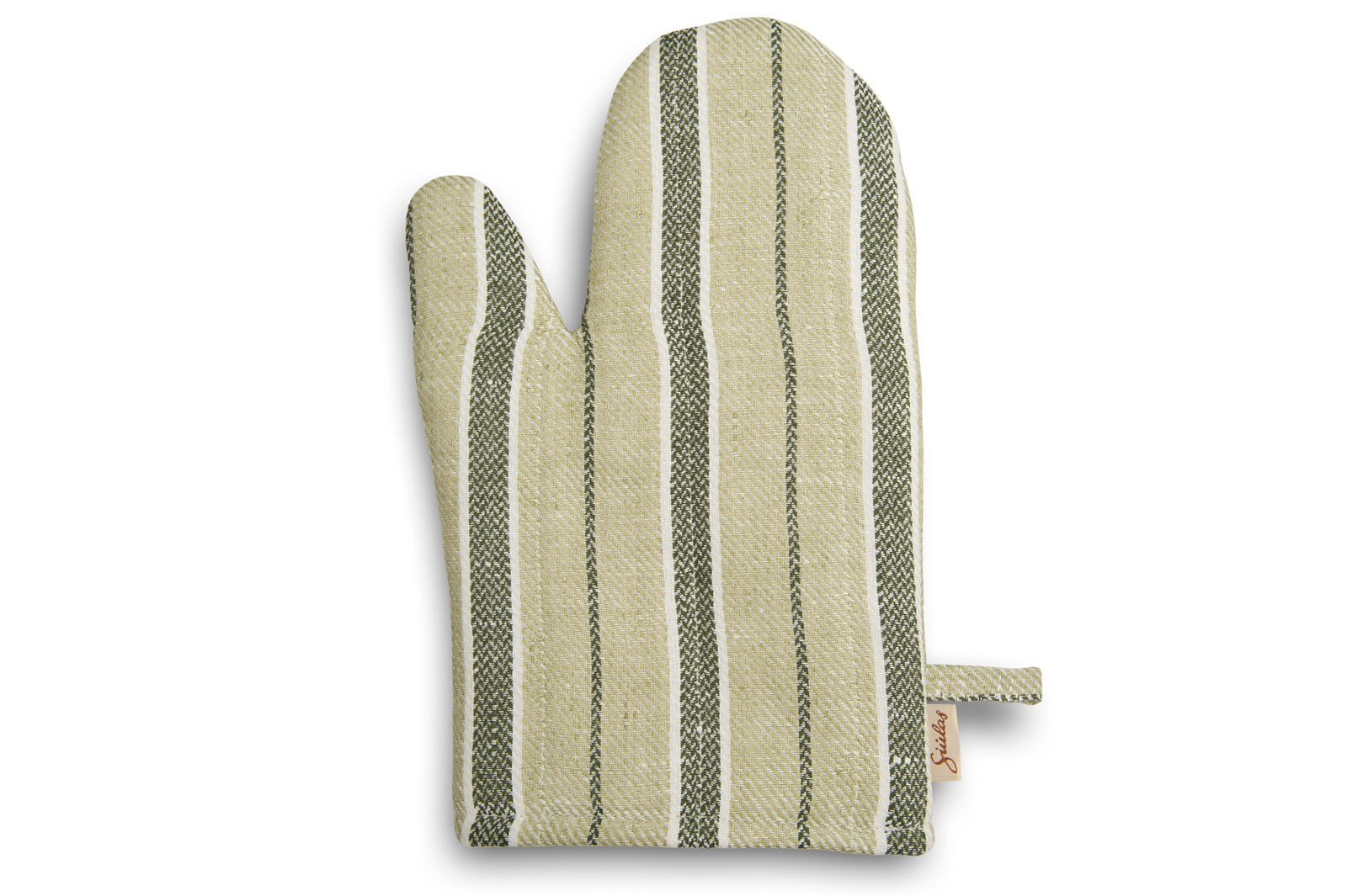 Rękawica kuchenna z lnianej tkaniny wytkanej w pionowe paski o rożnej szerokości: białe, jasno i ciemno zielone. Wytrzymała tkanina na zewnątrz i bawełniana watolina wewnątrz – ta rękawica będzie długo służyła.