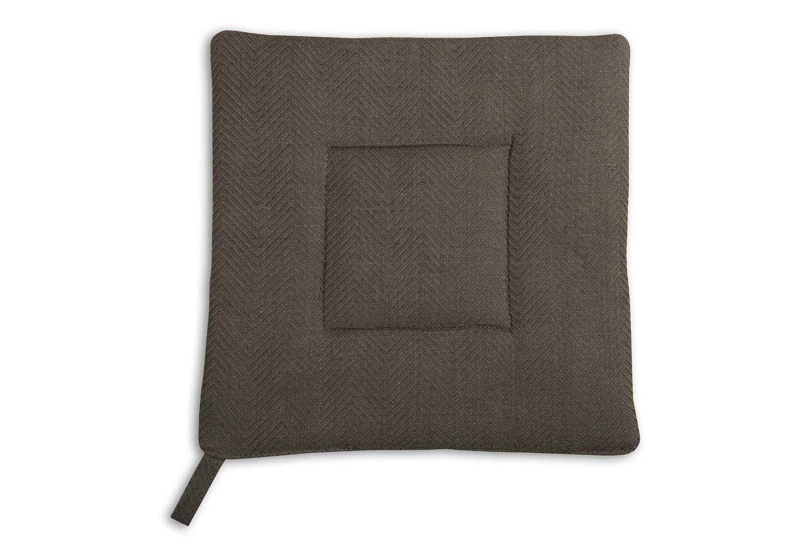 Uchwyt do gorących naczyń z tkaniny lniano - bawełnianej wytkanej we wzór jodełkowy. Ocieplony bawełnianą watoliną. Ma zawieszkę z boku. W naszym sklepie rękawica kuchenna do kompletu z identycznej, ciemnej, praktycznej tkaniny.