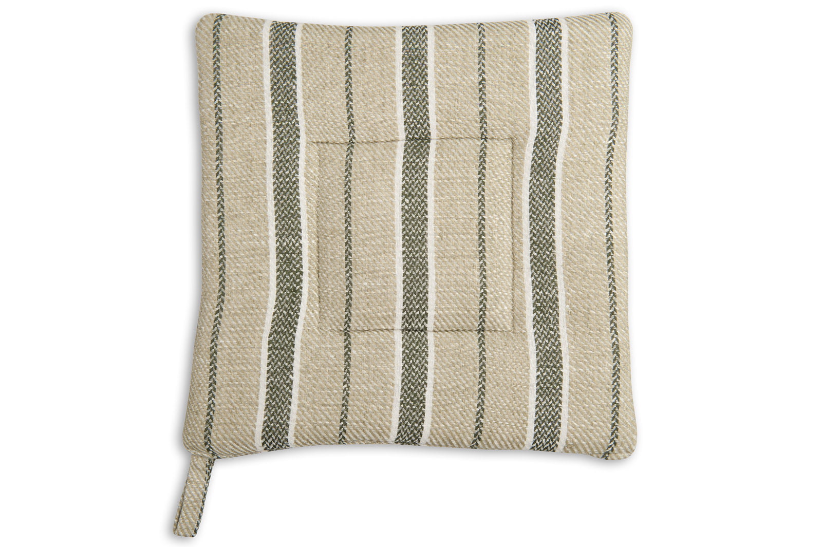 Uchwyt do gorących naczyń z tkaniny 100% lnianej wytkanej w białe oraz jasno i ciemno zielone paski. Ocieplony bawełnianą watoliną, wyposażony w wygodną zawieszkę. W naszym sklepie rękawica kuchenna z identycznej tkaniny.