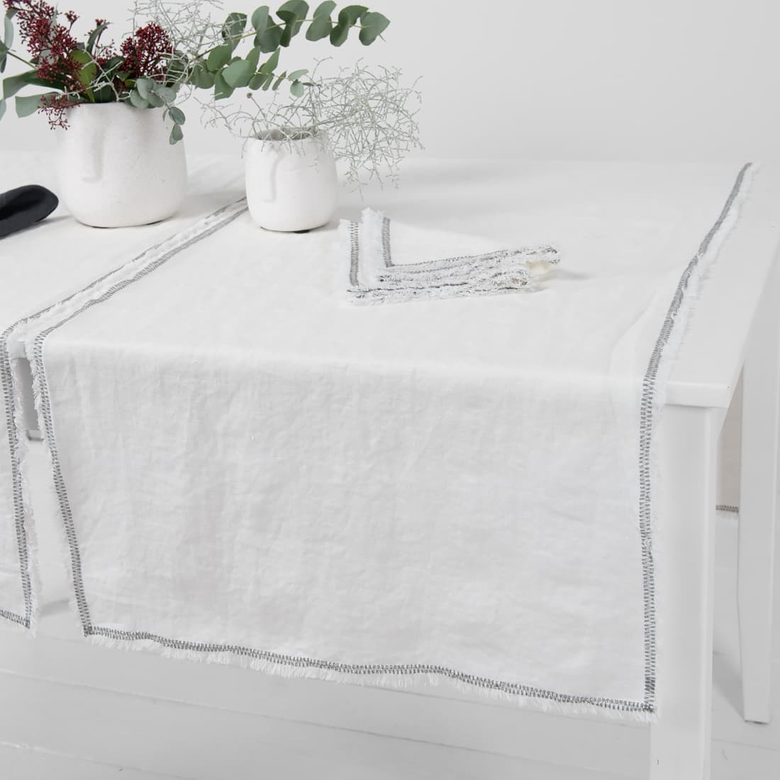 - Wykończenie brzegu: strzępione frędzelki 1,5cm, grafitowy (szary) ścieg owerlok