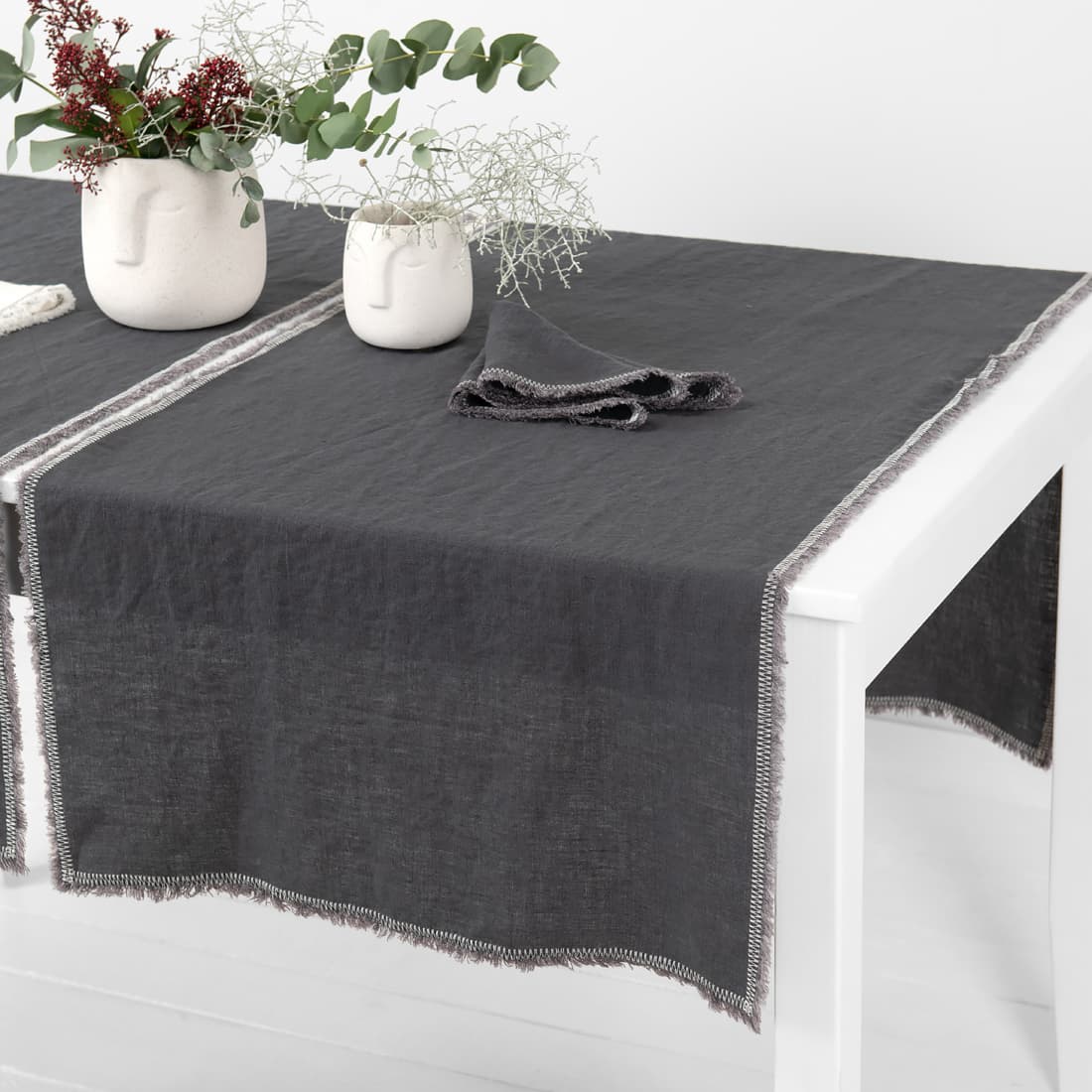 - Wykończenie brzegu: strzępione frędzelki 1,5cm, mlecznobiały ścieg owerlok