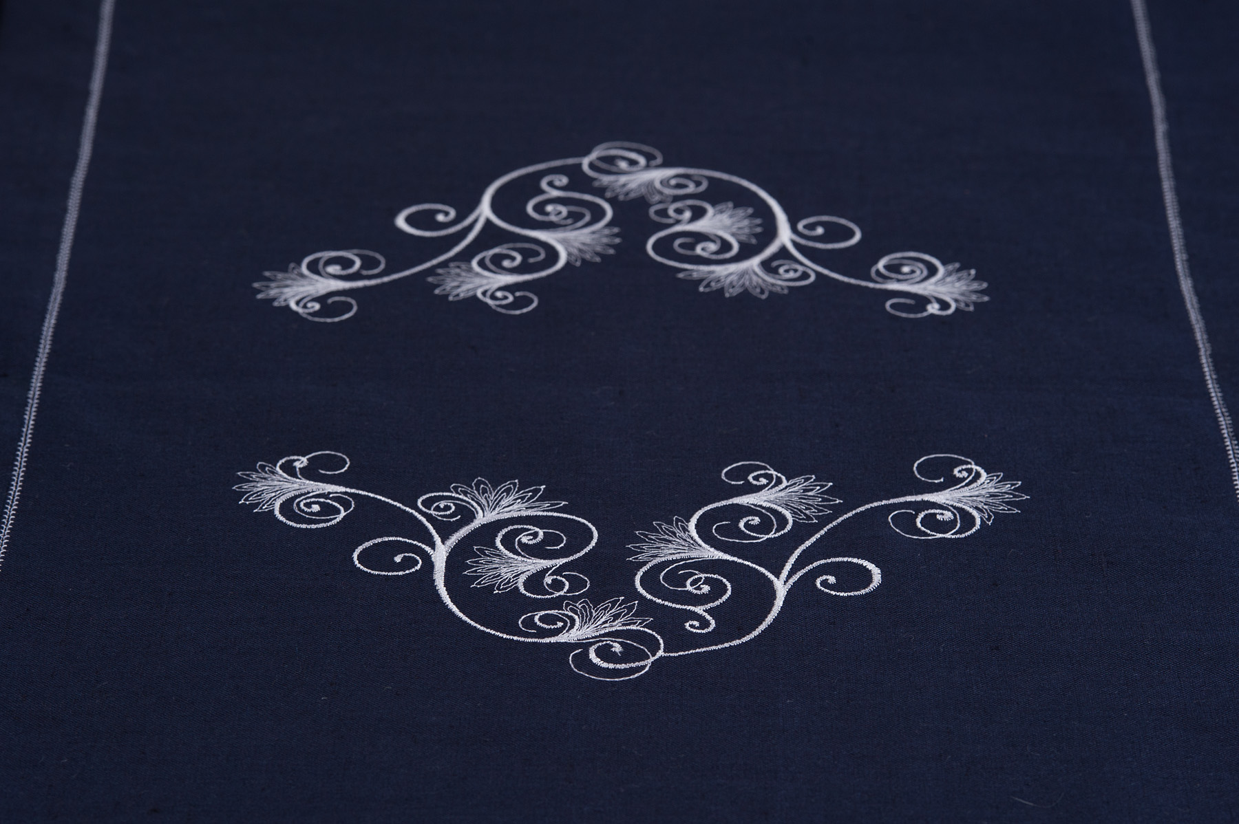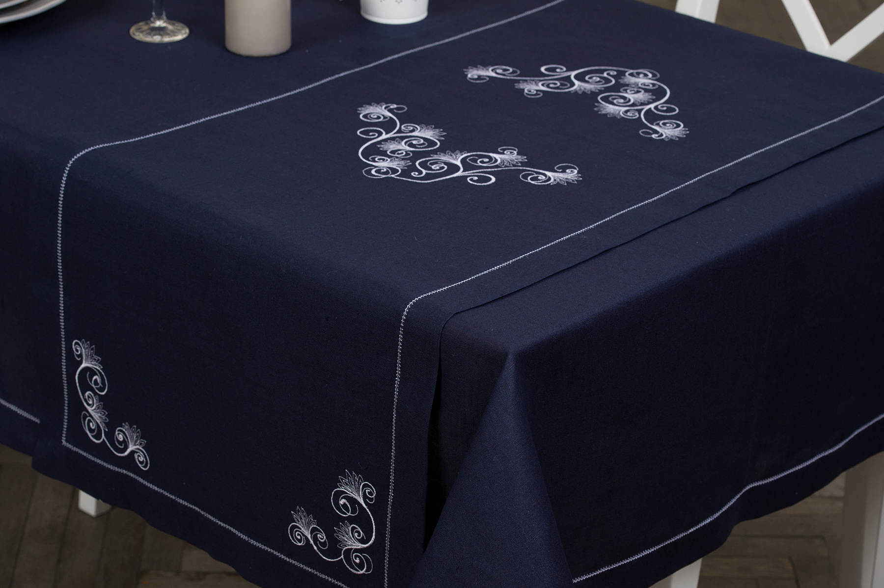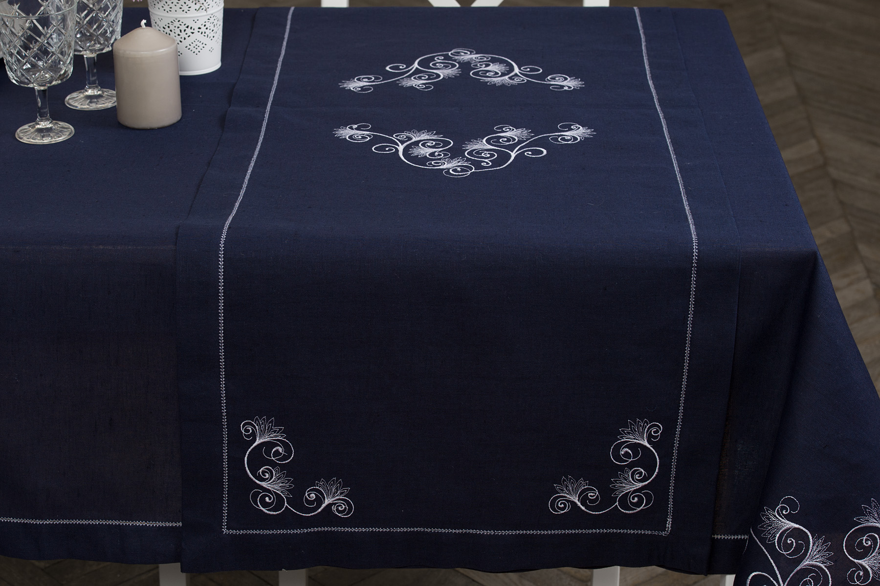 Granatowy lniano - bawełniany bieżnik stołowy ozdobiony po środku i w każdym z rogów delikatnym białym haftem. Brzegi bieżnika wykończono podwinięciem 4cm i ozdobiono jednym rzędem białej mereżki. Granatowy bieżnik użyj w zestawie z identycznie ozdobionymi obrusem oraz serwetkami z naszej kolekcji.