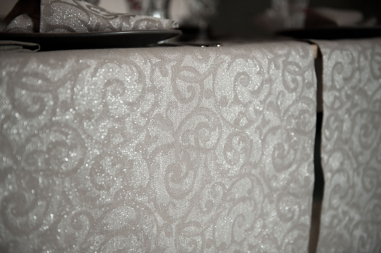 Świąteczny żakardowy lniano – bawełniany bieżnik stołowy. Jasne, srebrzyste, lekko połyskujące tło wytkano mlecznobiałą oraz ciemniejszą szarą przędzą w barokowy wzór, przypominający szron. Nakryj stół na dwoje, zapal świece – miłego wieczoru!