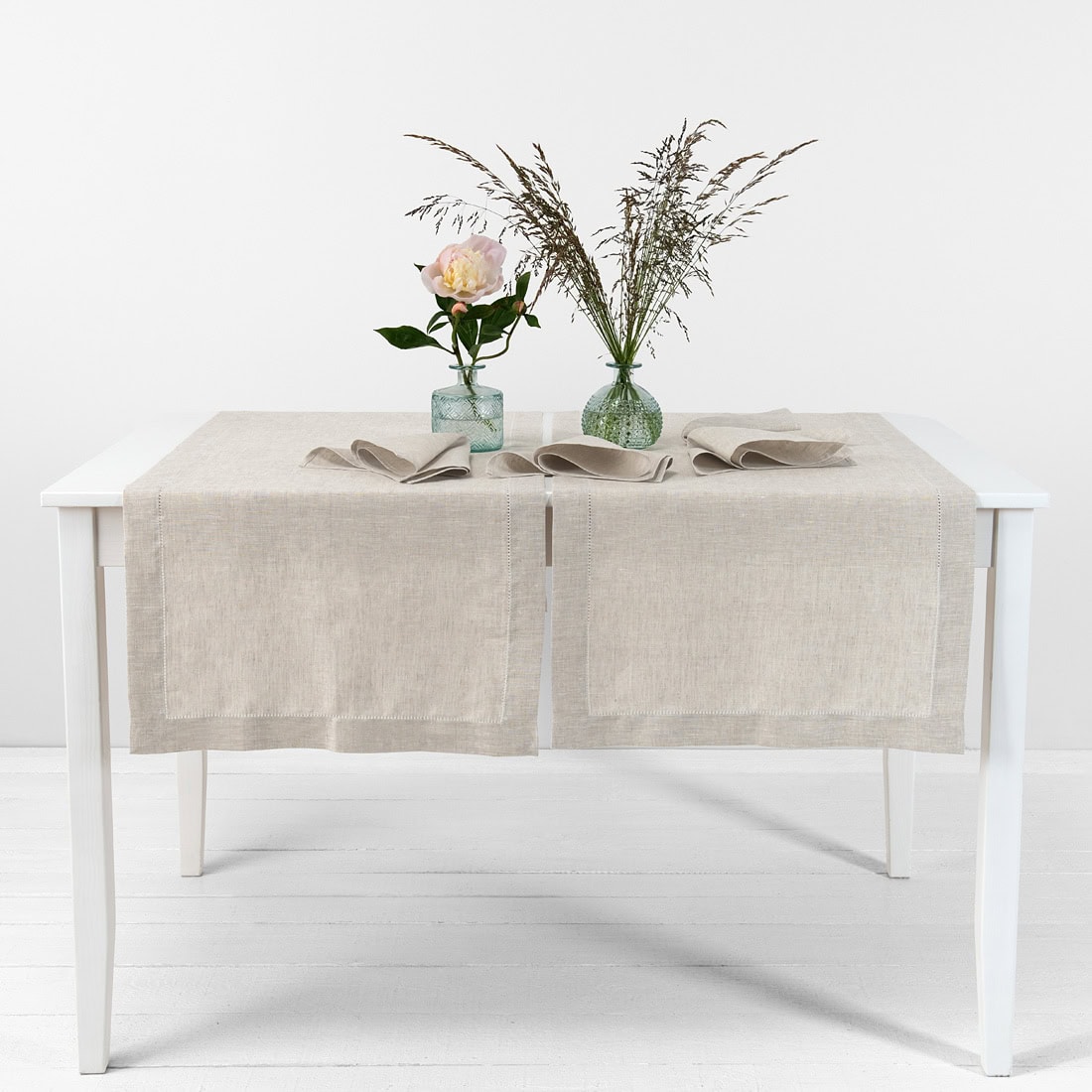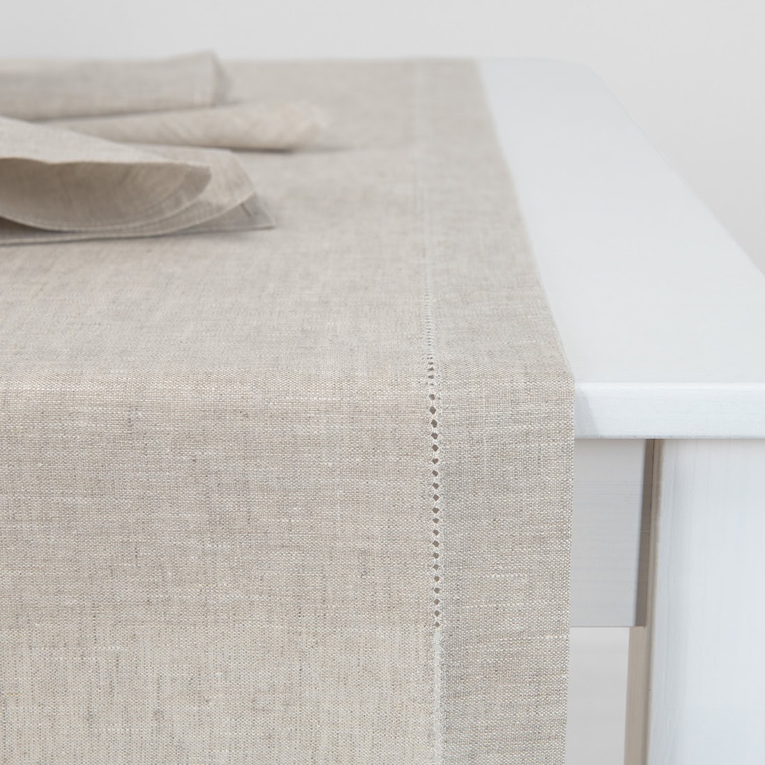 Jasnoszary, lniany bieżnik stołowy. Brzegi bieżnika zdobi rząd delikatnej mereżki. Skromnie zdobiony bieżnik przyda się w każdym domu. Bieżnik szczególnie elegancko wygląda użyty w komplecie z identycznie zdobionymi serwetkami stołowymi z naszej kolekcji.
