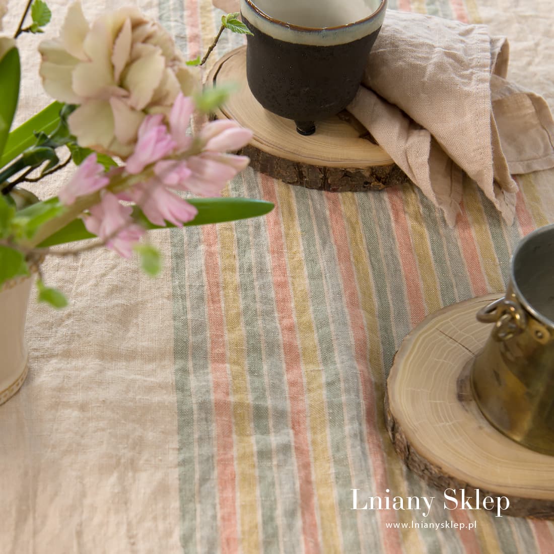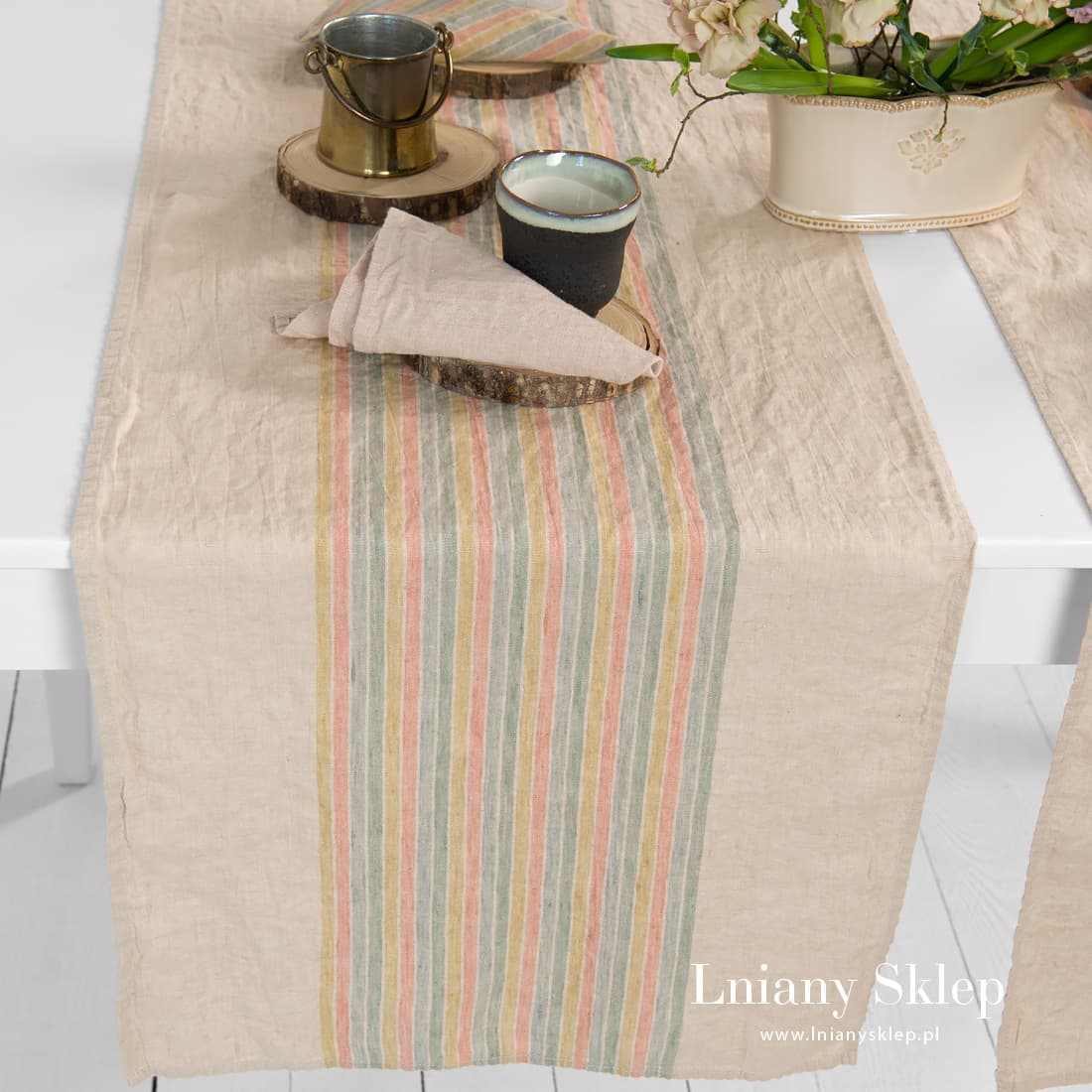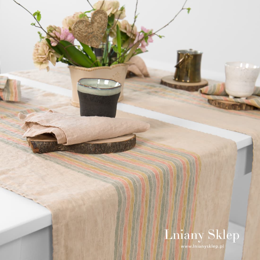 Beżowy bieżnik w pasy z tkaniny 100% lnianej. Uszyty z tkaniny pranej wytkanej na beżowym tle w zgrupowania pasków z przędzy piaskowej, zielonej, żółtawej (kolor imbiru), szarej, czerwonawejBieżnik jest lekko gnieciony i nie wymaga prasowania – pasuje na co dzień i na święta, ponieważ len gnieciony jest dziś absolutnie na topie! Dopasuj do tego bieżnika serwetki MEIZA lub MAIZA z naszej kolekcji.