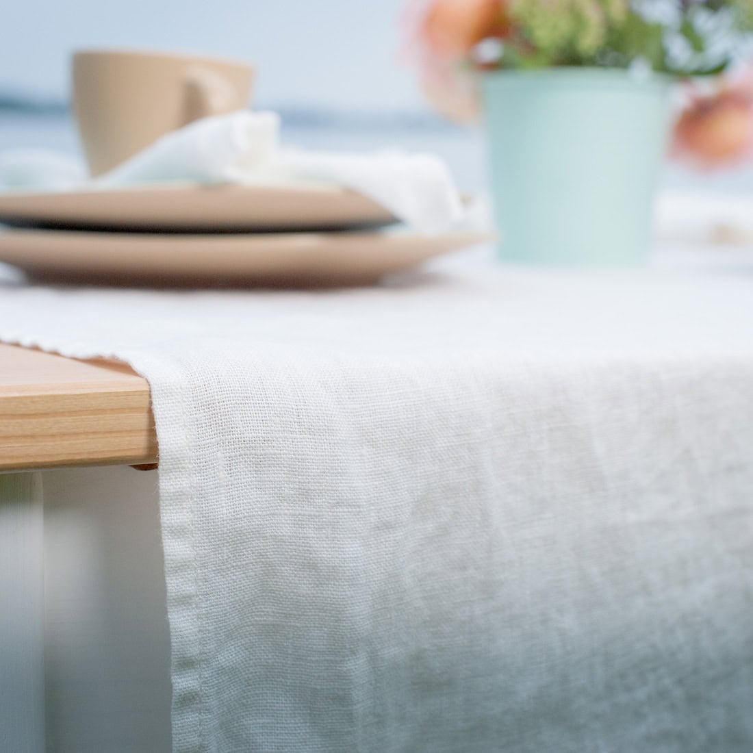 Bieżnik stołowy z mlecznobiałej (lekko żółtawej) tkaniny 100% lnianej. Elegancki w swej prostocie bieżnik z pranej podczas produkcji tkaniny, na stałe uzyskał gniecioną fakturę, jest miękki w dotyku, nie wymaga prasowania. W naszej kolekcji znajdziesz obrus i serwetki stołowe z identycznej tkaniny lnianej.