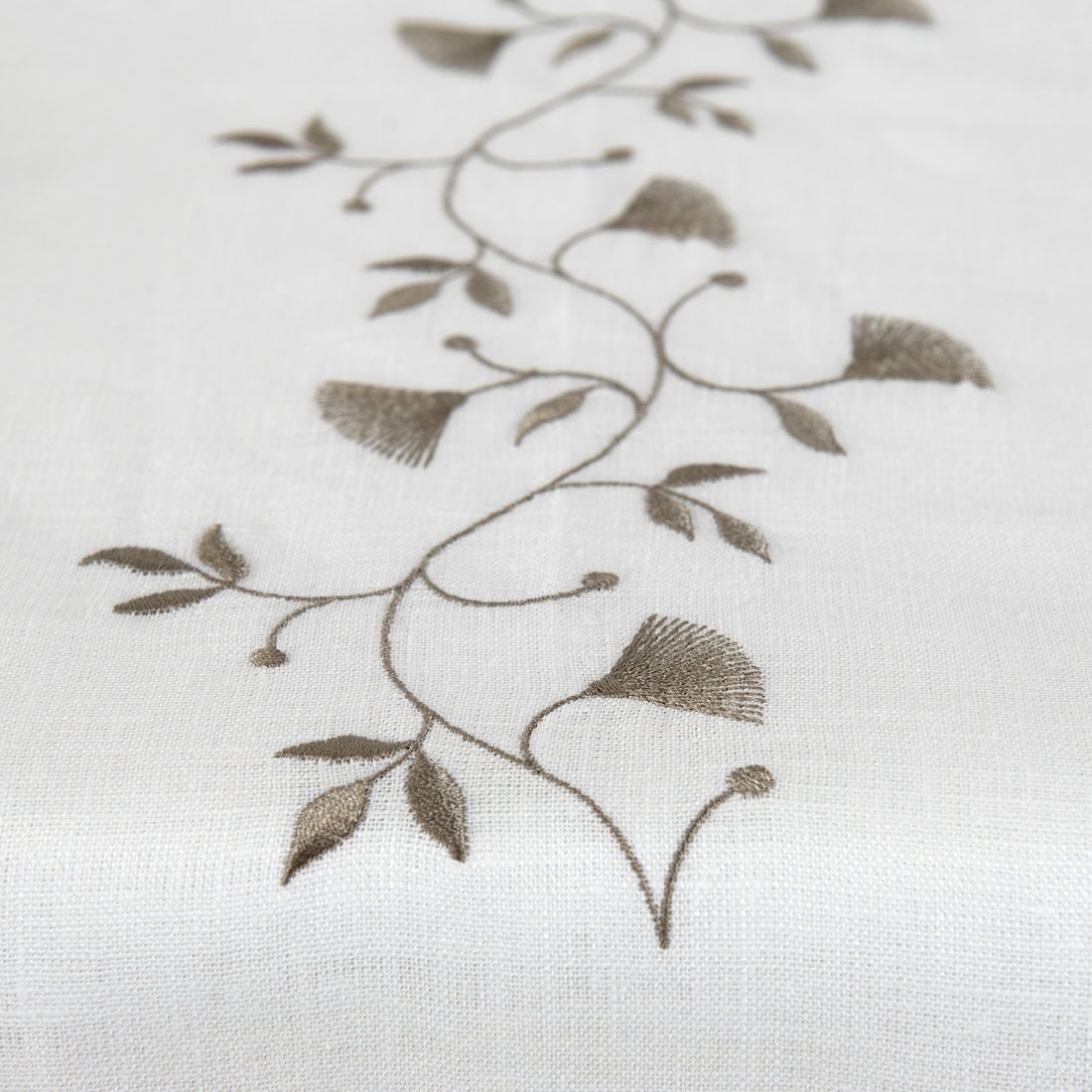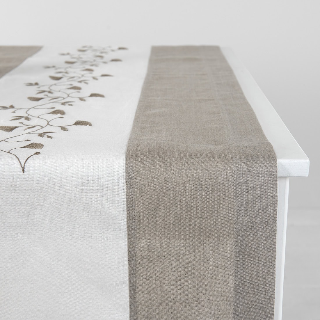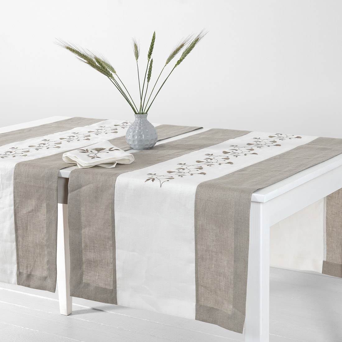 - Kolor: środek – z mlecznobiałej (lekko żółtawej) tkaniny lnianej, brzegi – z niebarwionej (szarej w piasek) tkaniny lnianej