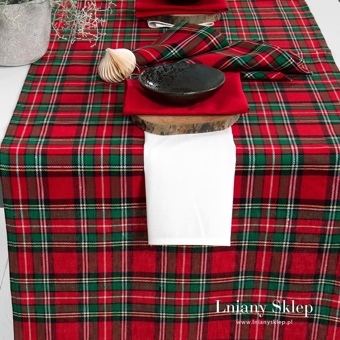 Bieżnik stołowy w kratkę z tkaniny lniano - bawełnianej wytkanej splotem skośnym z przędzy czerwonej zielonej, białej, żółtej i czarnej. Wytkany wzór kojarzy się z Wigilią i Nowym Rokiem. W naszej kolekcji znajdziesz obrus oraz serwetki stołowe z identycznej tkaniny. Komplet bielizny stołowej może być pomysłem na prezent świąteczny dla kogoś miłego.