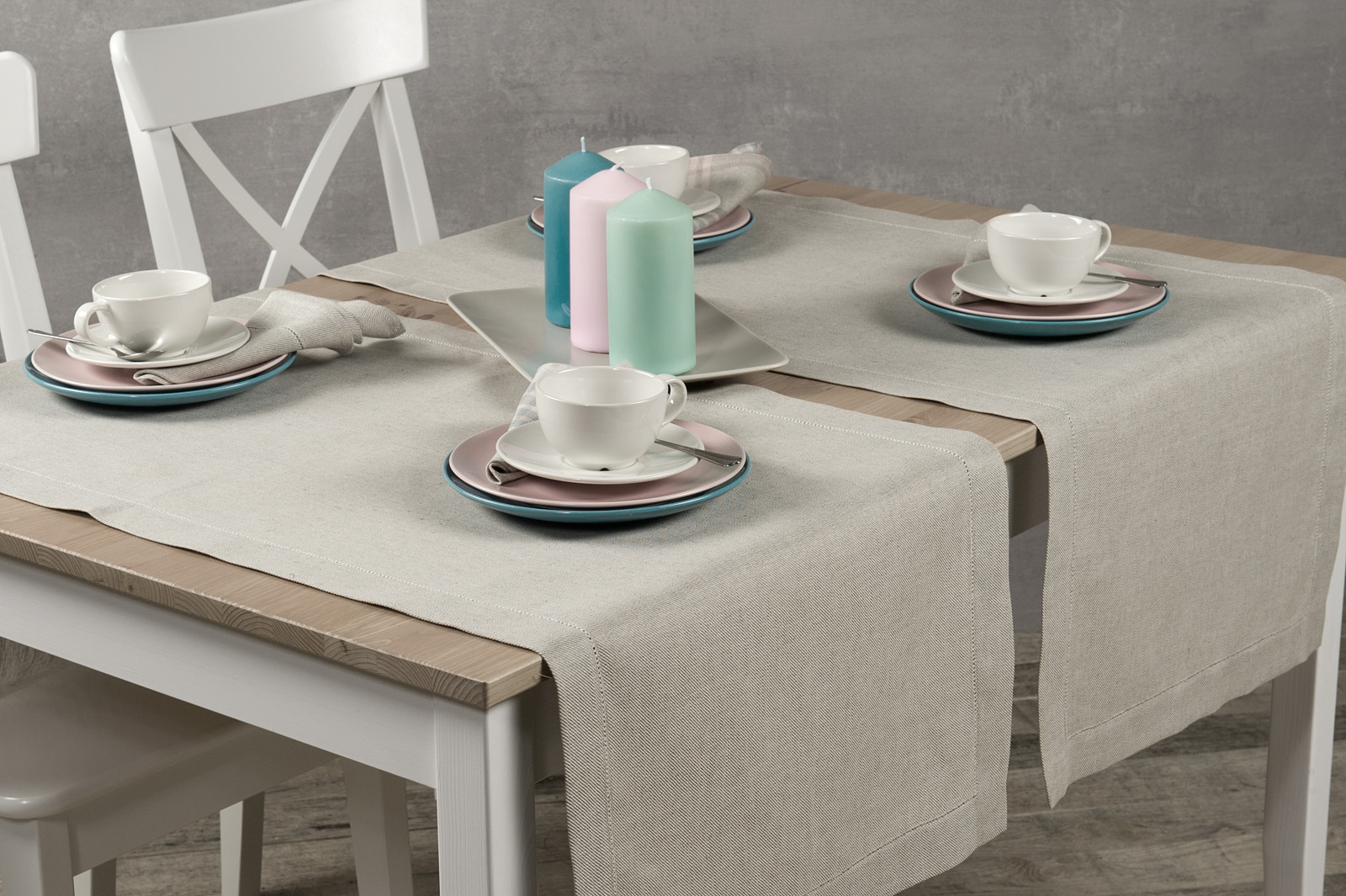 Szary bieżnik stołowy z tkaniny lniano – bawełnianej. Bieżnik z tkaniny wytkanej z przędzy białej i niebarwionej szarej splotem skośnym. Brzegi bieżnika podwinięte szeroko i ozdobione rzędem mereżki. Bieżnik w stylu klasycznej elegancji.